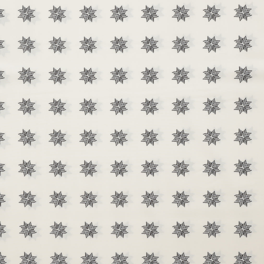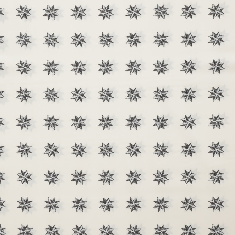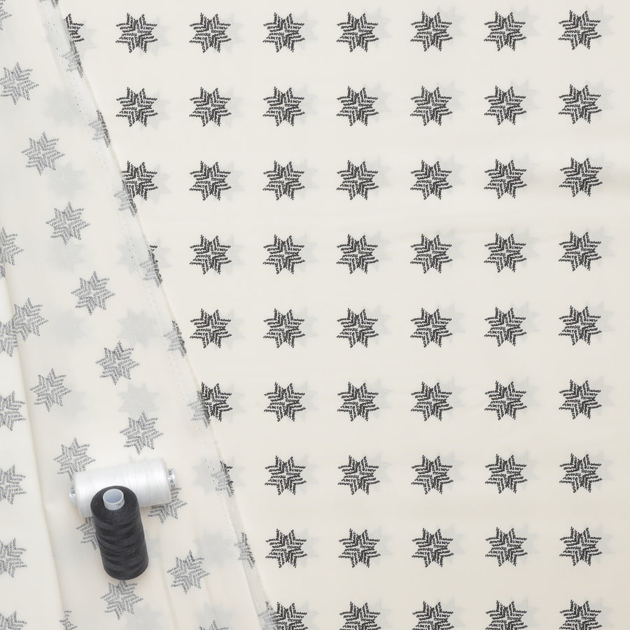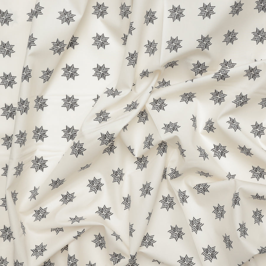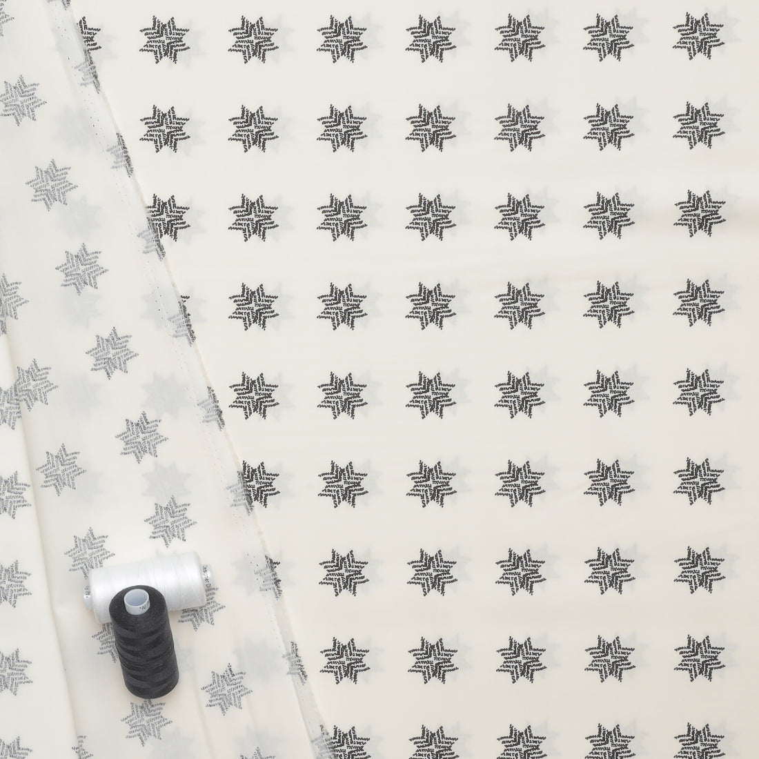 This quilting cotton features a cream background adorned with a repeating pattern of black compass point stars. The perfect fabric for adding a touch of shine and a unique design to any quilting project.