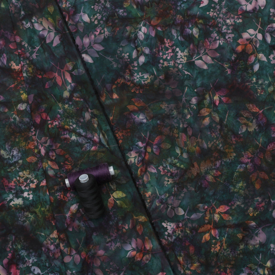 Experience the beauty of nature with our Bali Batik cotton fabric! The stunning relief of leaves against a jewel-tone and black background will add a touch of elegance to your quilting project. Each piece is handcrafted, giving it a unique and vibrant look. Transform your creation into a masterpiece with our Mixed Foliage fabric.