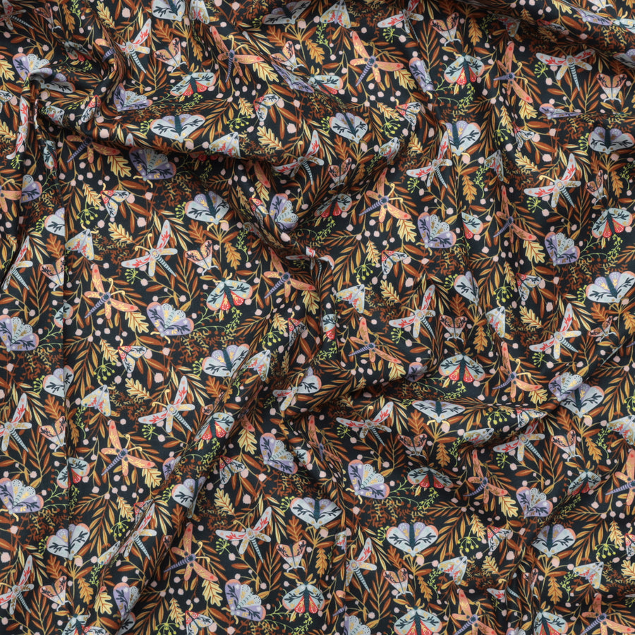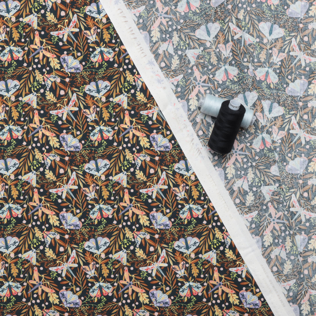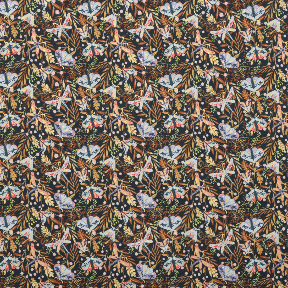 Unleash your imagination with Cotton + Steel's Myth + Dream fabric. Watch as fanciful moths and dragonflies flutter above lush foliage in this insect-inspired design. Perfect for adding a whimsical touch to any project. Fly away to Dreamland with Forest Night!