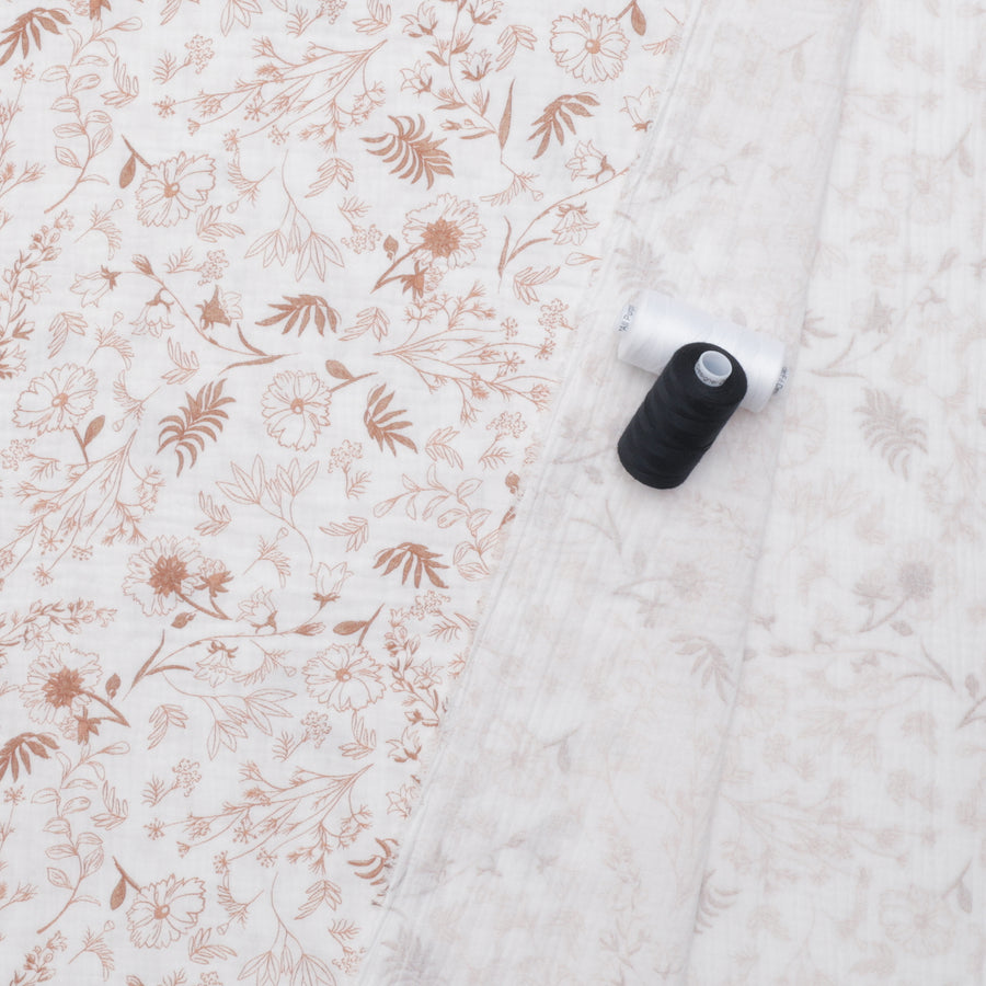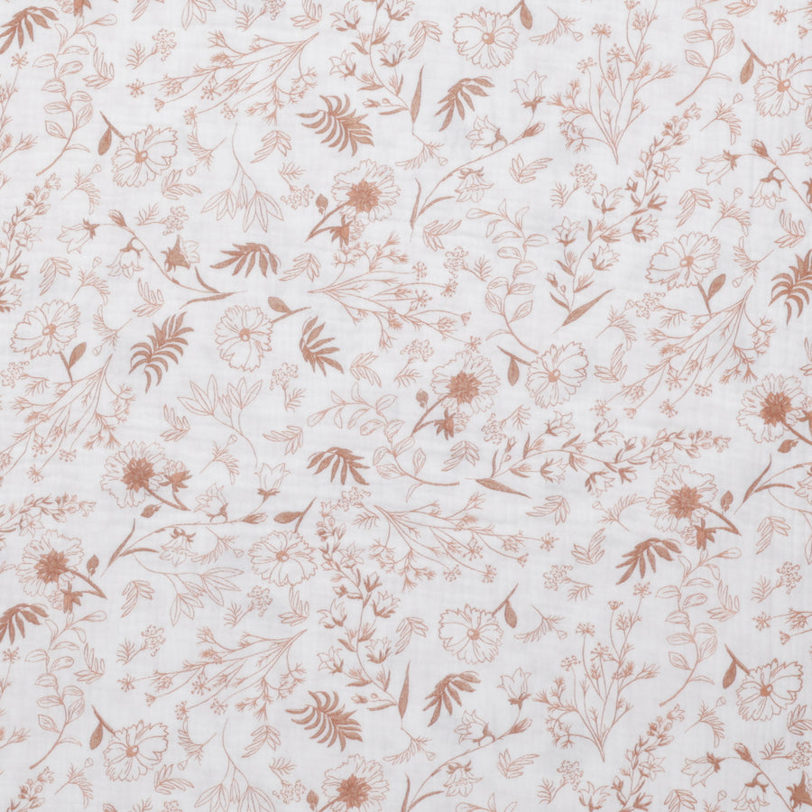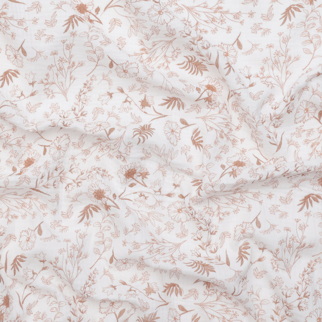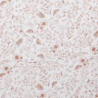 The thin lines of flowers and leaves in a light reddish brown pop against a bright white background on this cotton double gauze. The botanical design brings many types of wild flowers and leaves together to celebrate nature.