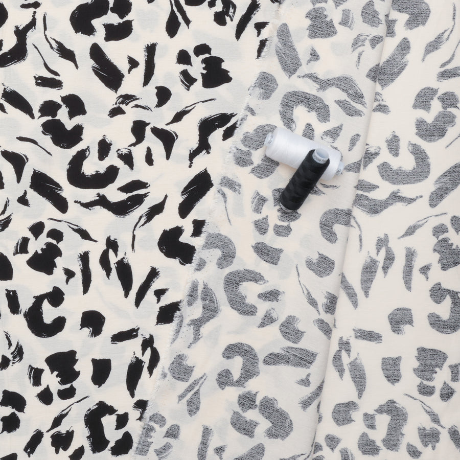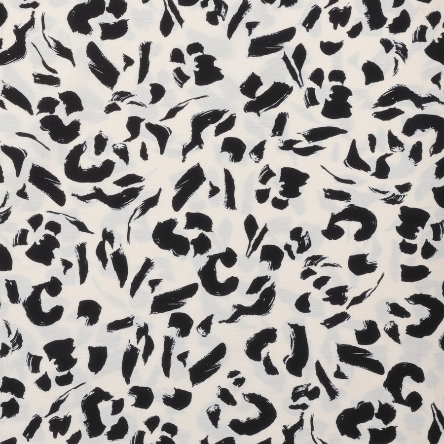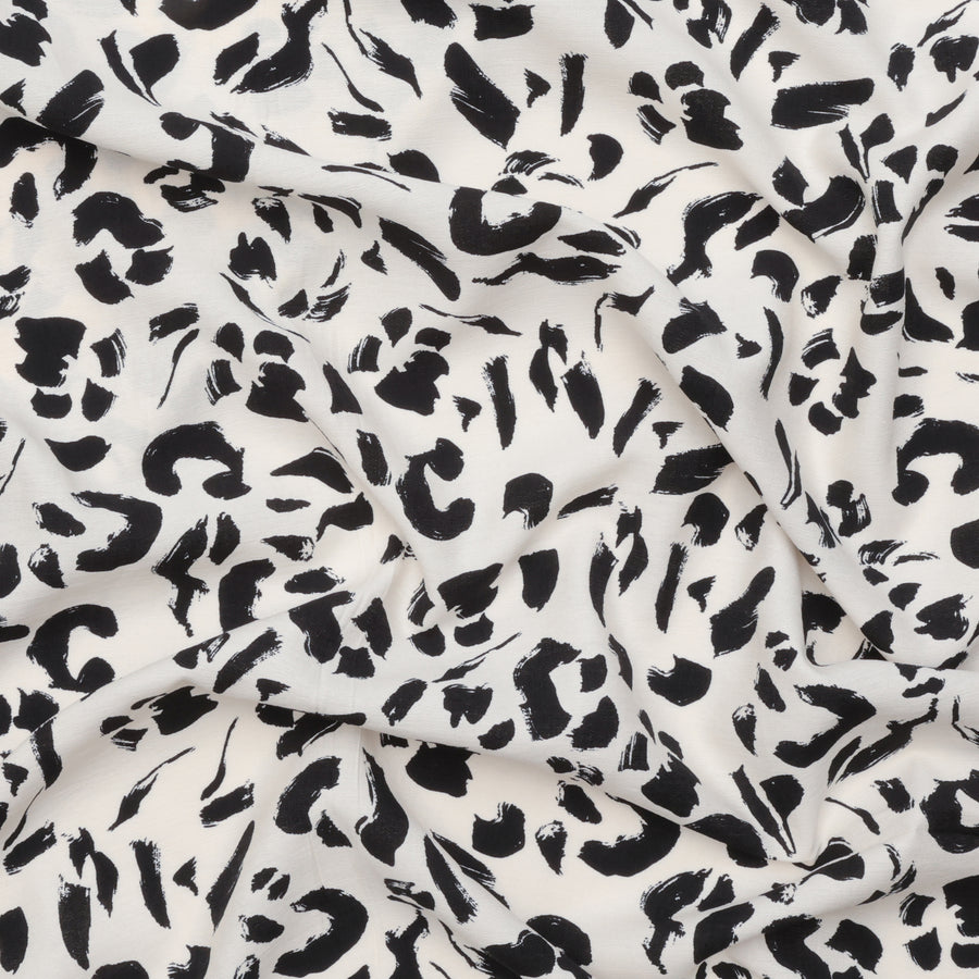 Want some movement in your garment? Grab this abstract animal print! Black splotches and dabs on a white background make for an expressive pattern. This fabric has a slight crinkled texture and is light and airy. Perfect for warm weather.
