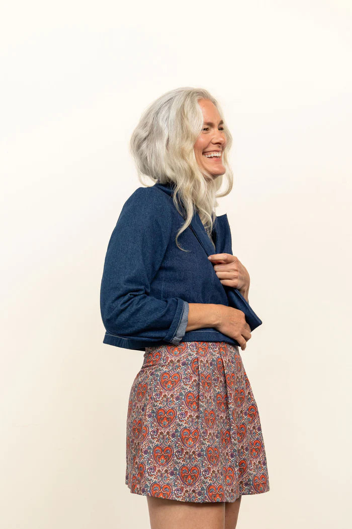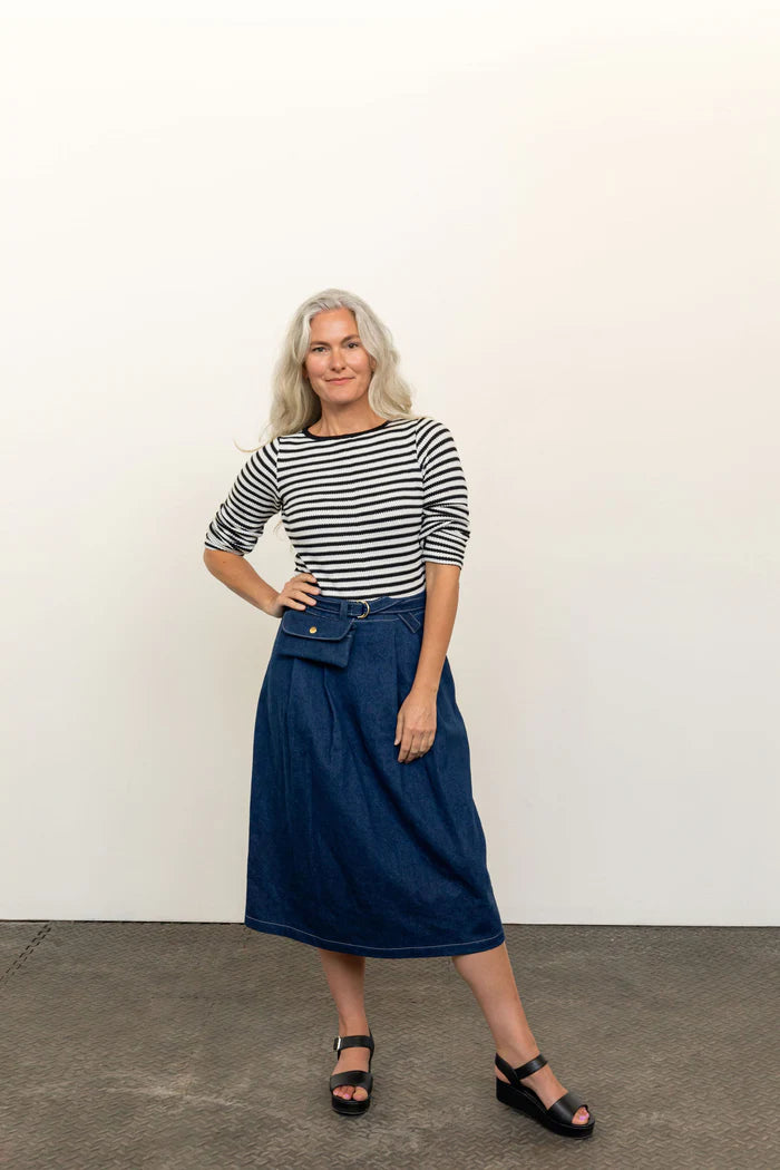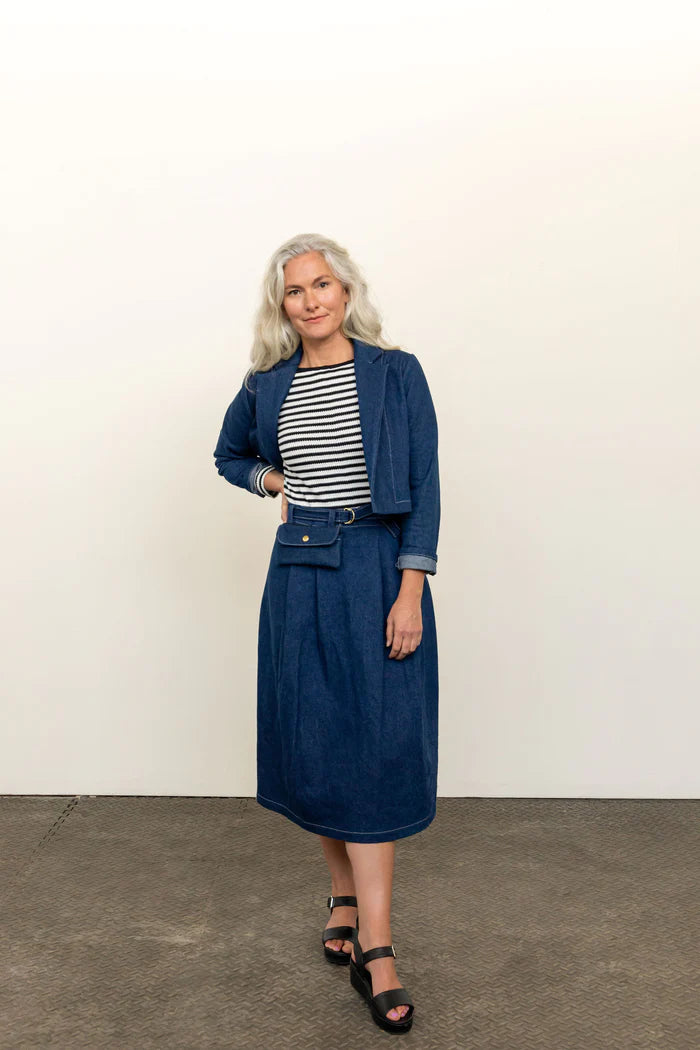 The Bernadette is a party in a skirt; pleated in the front - darted in the back! Plus, store your treasures in style with the super fun belt bag! The pattern includes the skirt in two length options; mini and midi. The belt is closed with D-rings and the bag features a zipper pocket, front pouch, and flap. This is a versatile and fun to sew pattern that you’ll want to sew in every color. Designed for mid-weight woven fabrics, the Bernadette looks great in anything from linen, to denim, to a rayon twill! If you’re looking for a cute and comfortable skirt, you need Bernadette in your life.