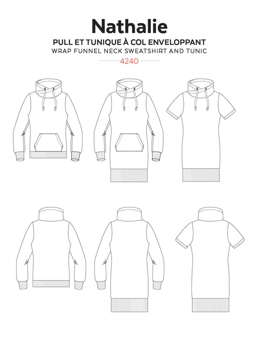 Sewing pattern for a comfortable sweatshirt (A) or tunic/sweater dress (B) with a chunky wrap funnel neck and optional kangaroo pocket. The garment is finished with a hem band. Choice of long sleeves with cuffs or short hemmed sleeves.