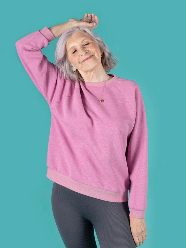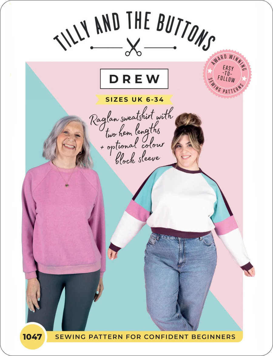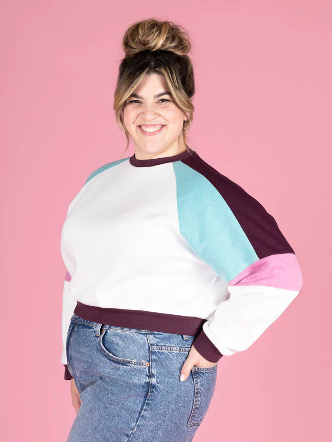 Meet your new obsession, the Drew sweatshirt sewing pattern. The easy-fitting style and raglan seams make for a speedy and satisfying sew, and a perfect introduction to sewing with stretch knit fabrics – whether you make it on a regular sewing machine (with a zigzag stitch) or overlocker (serger) is up to you. Keep it simple with one solid colour or print, or let your creativity loose with the playful colour block sleeve (great for scrap busting!).