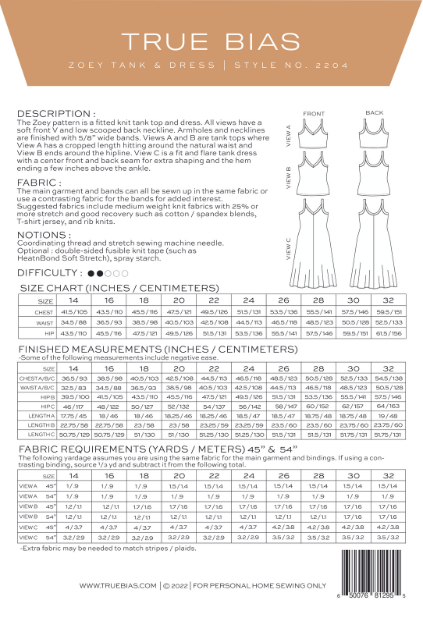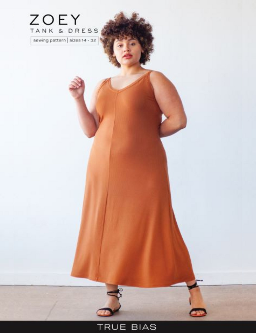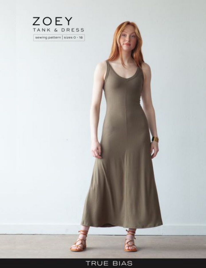The Zoey pattern is a fitted knit tank top and dress. All views have a soft front V and a low scooped back neckline. Armholes and necklines are finished with 5/8” wide bands. Views A and B are tank tops where View A has a cropped length hitting around the natural waist and View B ends around the hipline. View C is a fit-and-flare tank dress with a center front and back seam for extra shaping and the hem ending a few inches above the ankle.