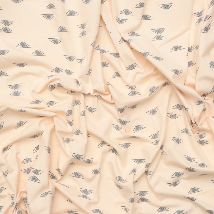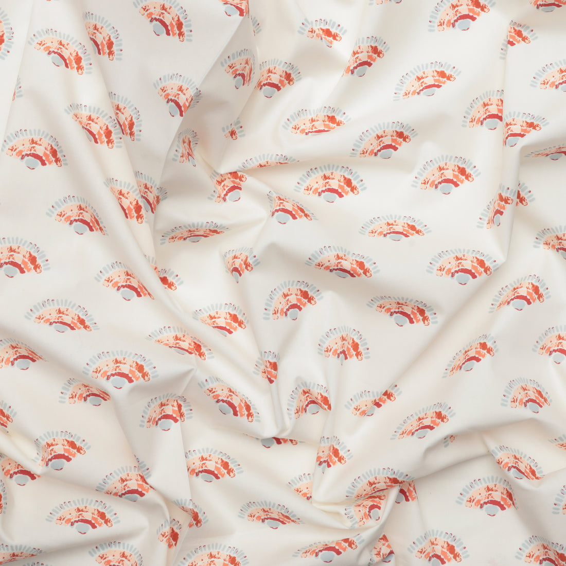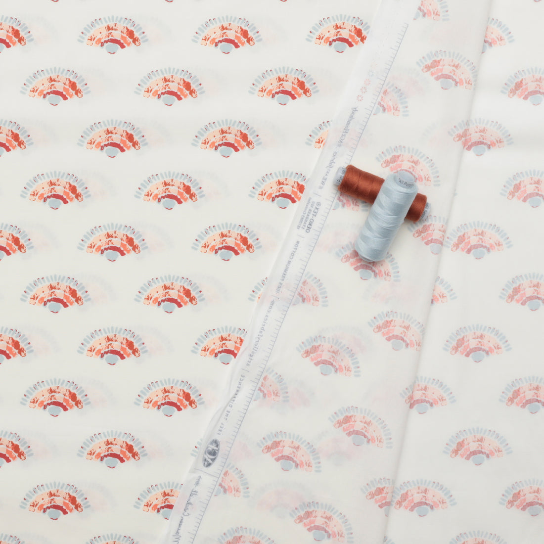 This AGF cotton blend fabric features a unique pattern of abstract fan shapes in muted hues of orange and blue on a cream background. Add a touch of sophistication to your home decor with this versatile and cozy fabric, perfect for creating a chic and relaxing atmosphere.