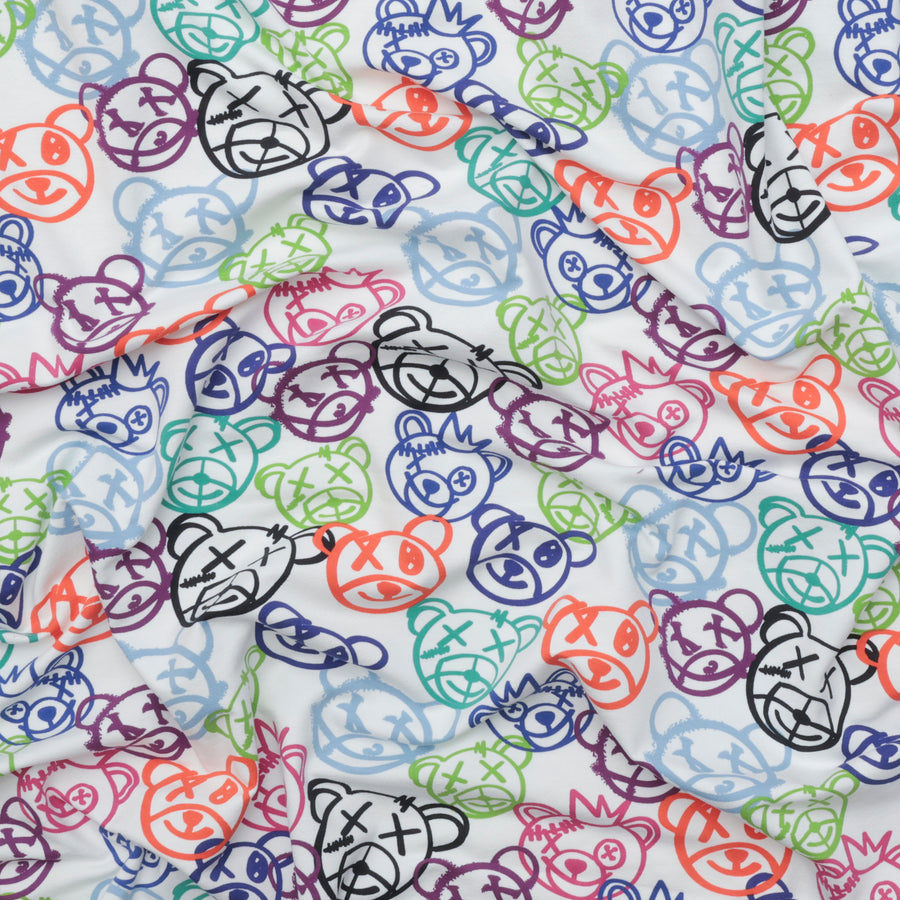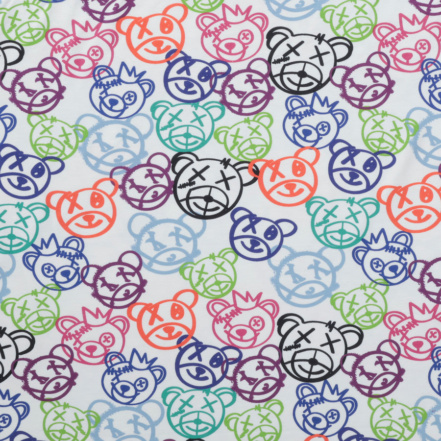 These teddy bears have seen it all and have the scars to prove it. This graffiti-style print of multi coloured bear heads on a white background showcases some tough teddies sporting crowns, x's for eyes, and stitched-up tears. Add some grit to your sweatshirts, pajamas, and more with this French terry.