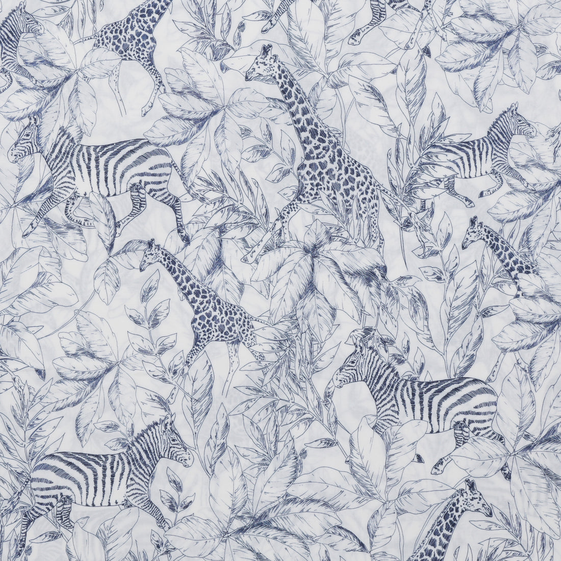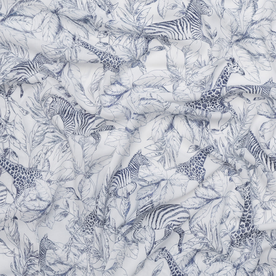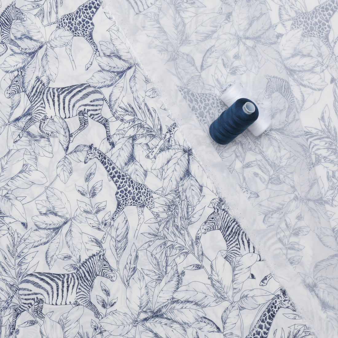 Add a touch of whimsy to your wardrobe with our Viscose Safari fabric. Featuring lively blue drawings of zebras and giraffes frolicking through lush foliage, this deadstock Italian designer fabric is perfect for lightweight and playful designs.