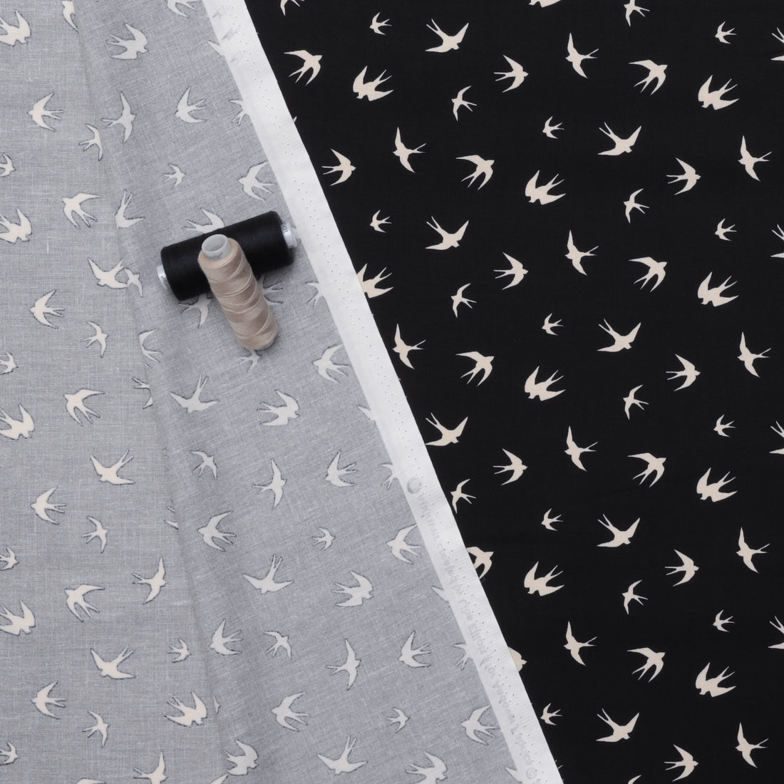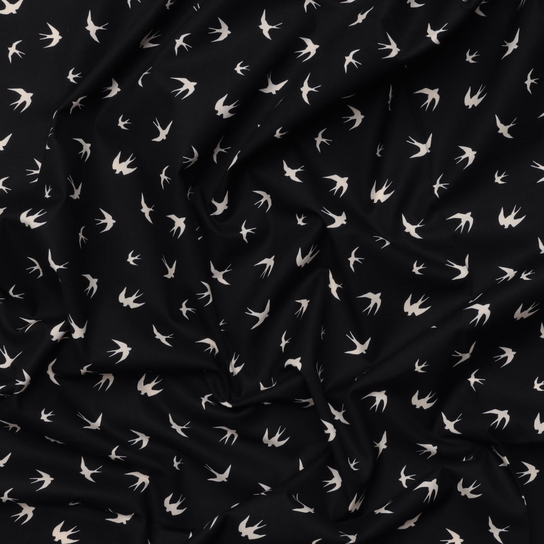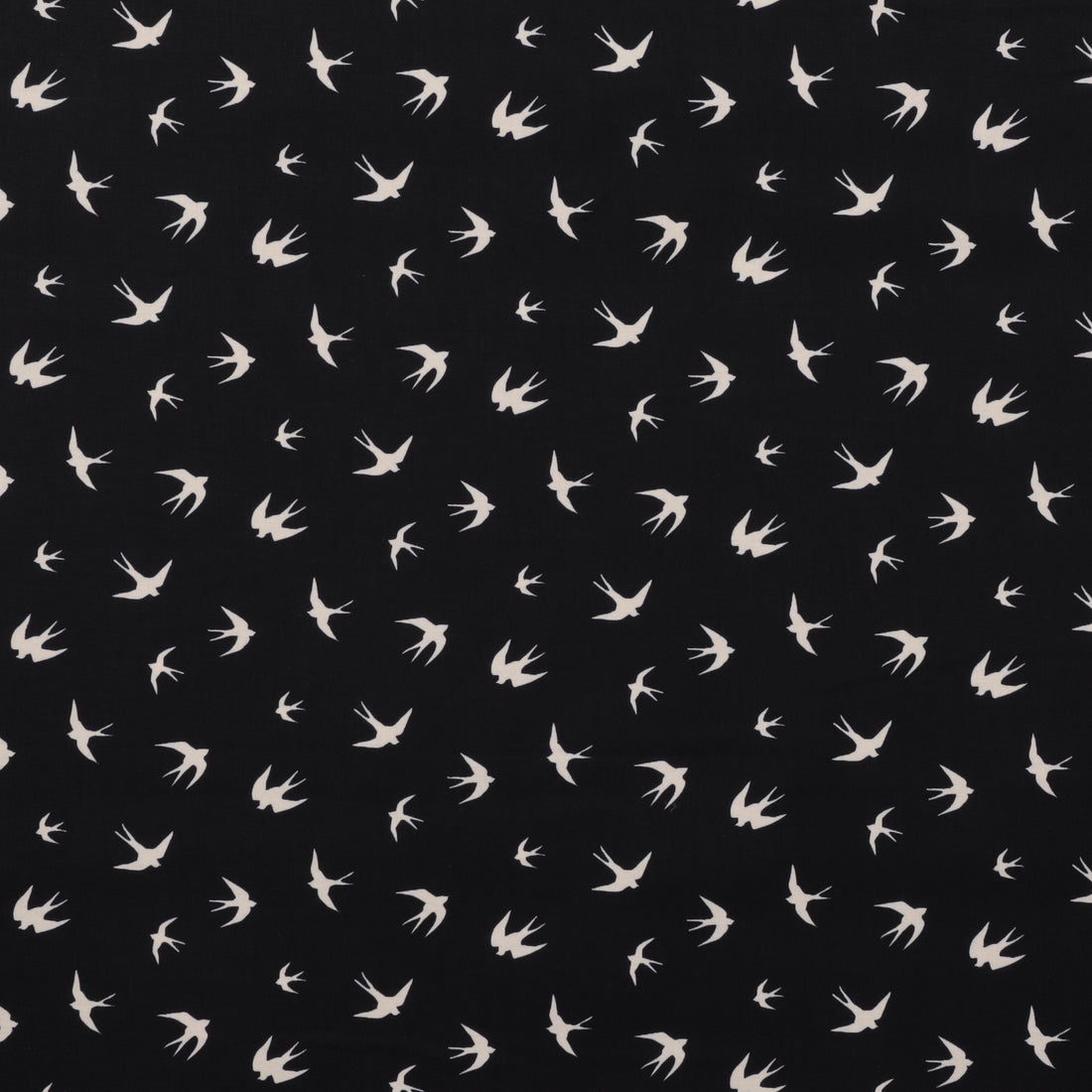 Experience a coastal paradise with Andover - Cotton - Verdigris - Beaches - Patina. The black backdrop sets the scene for cream silhouettes of graceful swallows, bringing a touch of nature to your next project. Lose yourself in the serenity and beauty of this stunning piece.