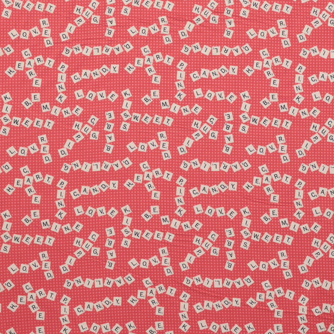 Make your next quilting project a playful one with Camelot's licensed cotton featuring a red dot background and charming Scrabble tile print of "Love," "Be Mine," "Sweet," and more. Perfect for board game lovers and those looking to add a touch of whimsy to their designs.