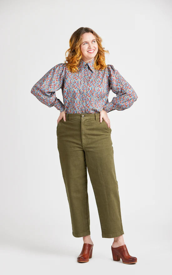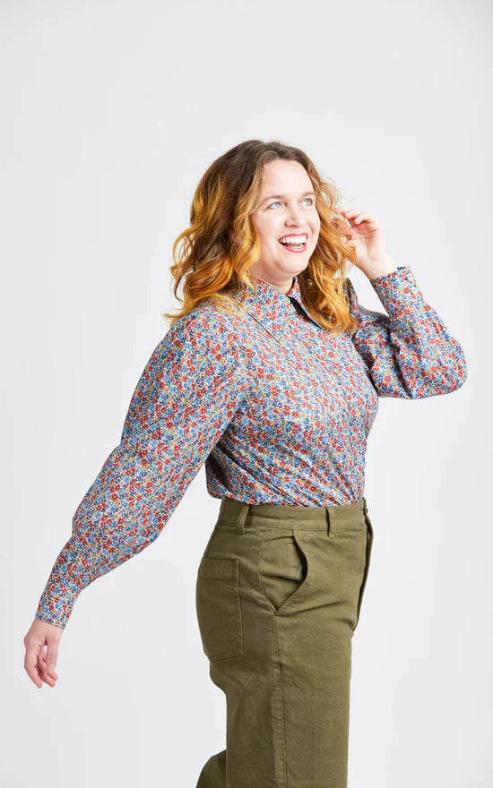 Reclaim the button-up with the Vernon Shirt! This boob-friendly take on the essential button-up shirt features two views: View A is a classic shirt with a traditional collar and collar stand, and full sleeves with narrow cuffs. View B is a fashion-forward version with a dramatic collar, covered button placket, and lantern sleeves with wide cuffs.