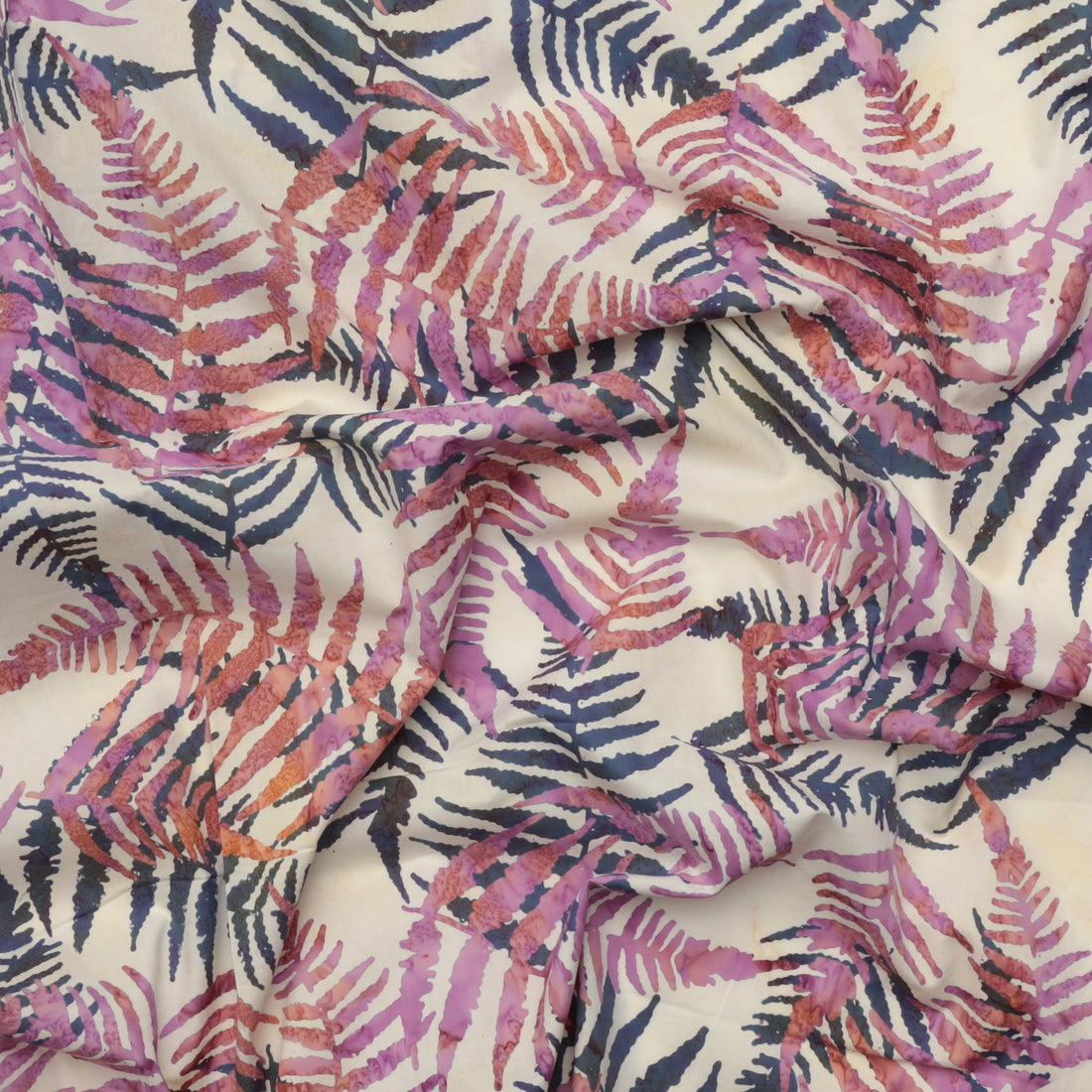 Transform your home into a tropical paradise with our Cotton - Bali Batik - Verns Victoria fabric. Featuring delicate reliefs of ferns in dark grey blue, pink, and orange on a cream background, this fabric is perfect for creating a natural and vibrant atmosphere. Bring the beauty of nature inside with this stunning botanical print.
