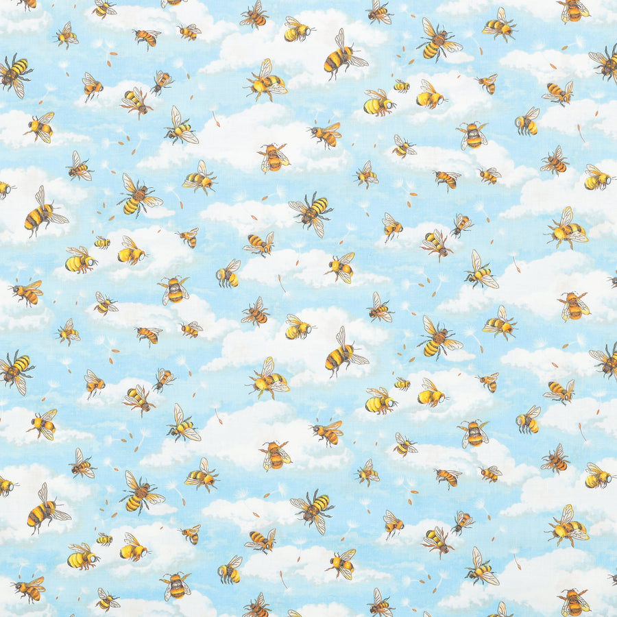 This quilting cotton is the bee's knees! Puffy white clouds on a bright blue sky show off a swarm of bumblebees buzzing about and collecting pollen from flowers. Add a bit of buzz to your projects with this buzzing Cotton - Beehaven - Clouds!