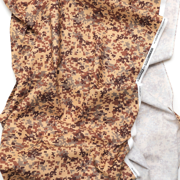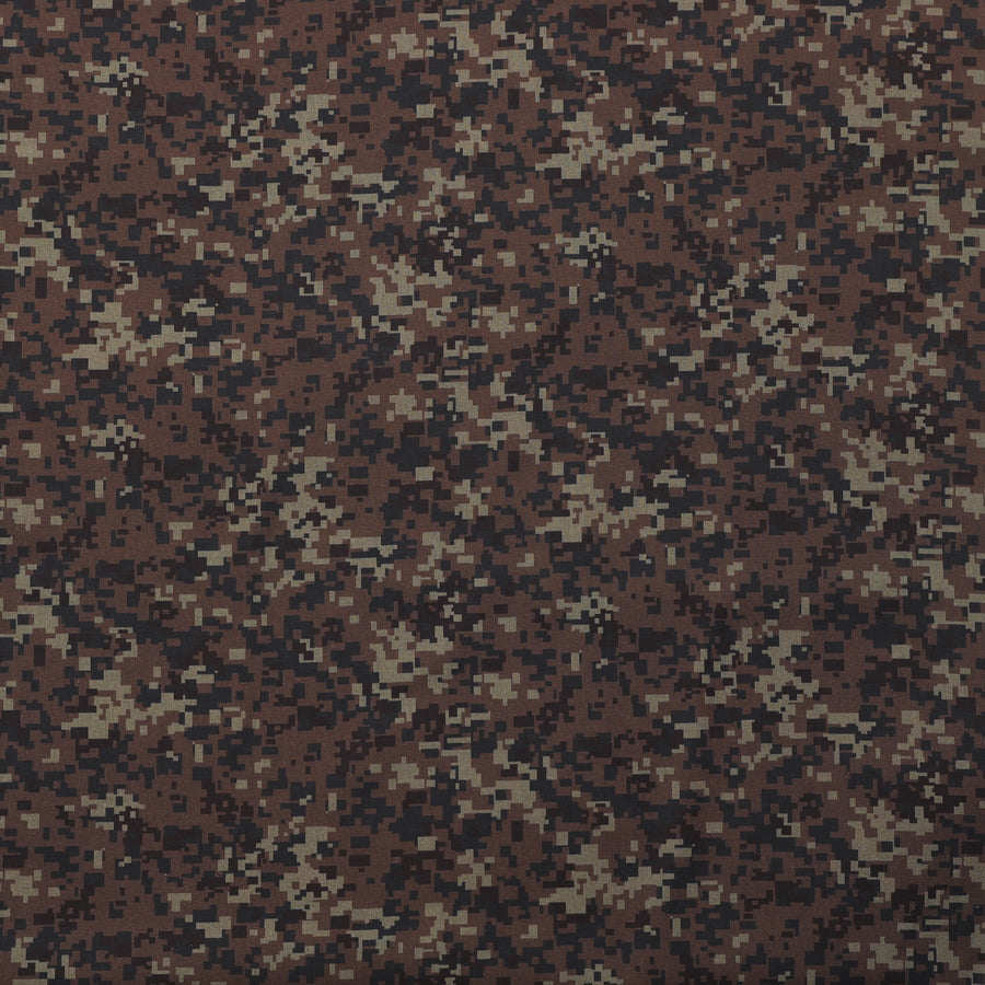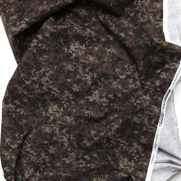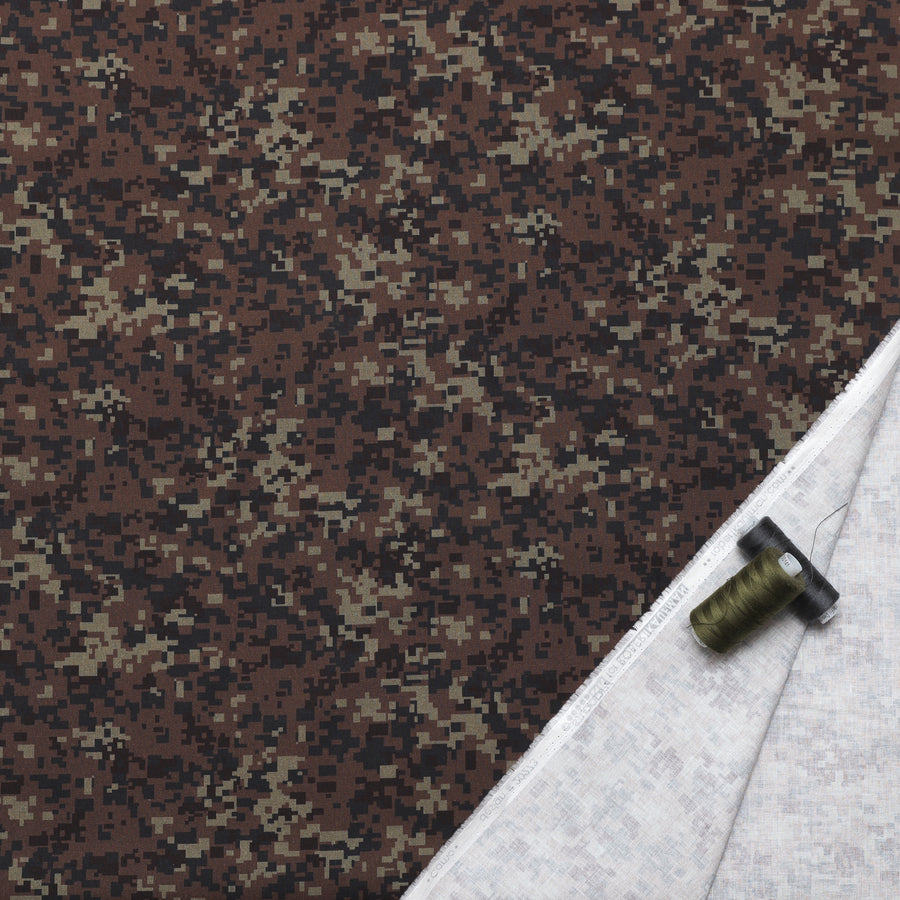 This quilting cotton showcases a fun pixel-style army camouflage in shades of green and brown.