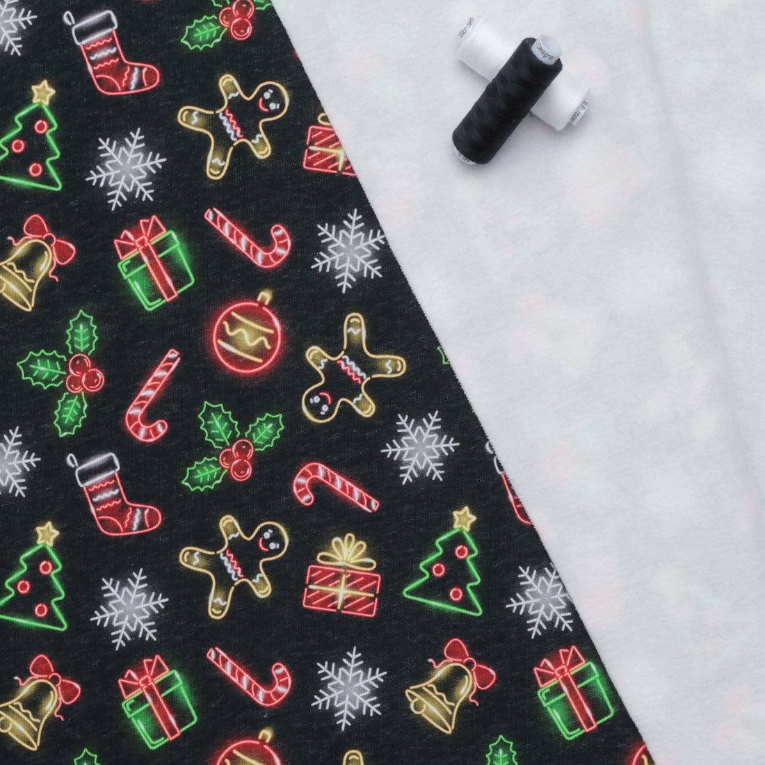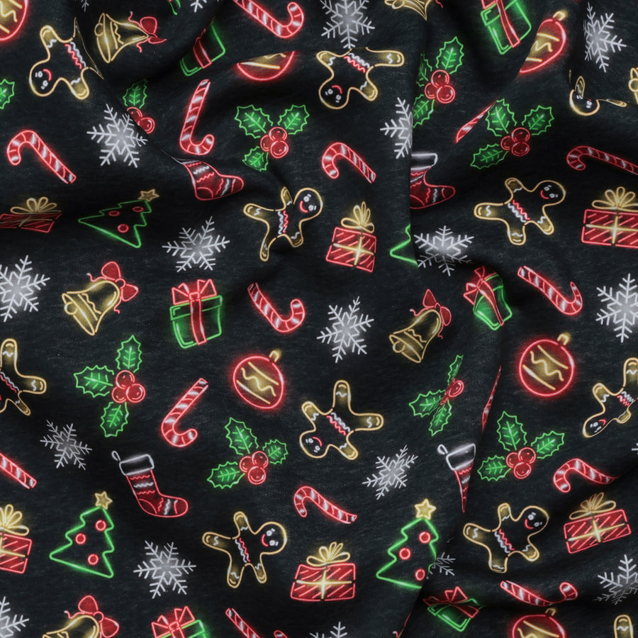 Get festive with our holiday printed knit fleece, featuring Christmas ornaments, gingerbread, presents, candy canes, bells, and snowflakes glowing like little neon lights on a black background. Ideal for garments like hoodies,  jogging pants and cardigans. Stay cozy and stylish this holiday season in our soft sweatshirt fleece. Happy holidays (and happy lounging)!