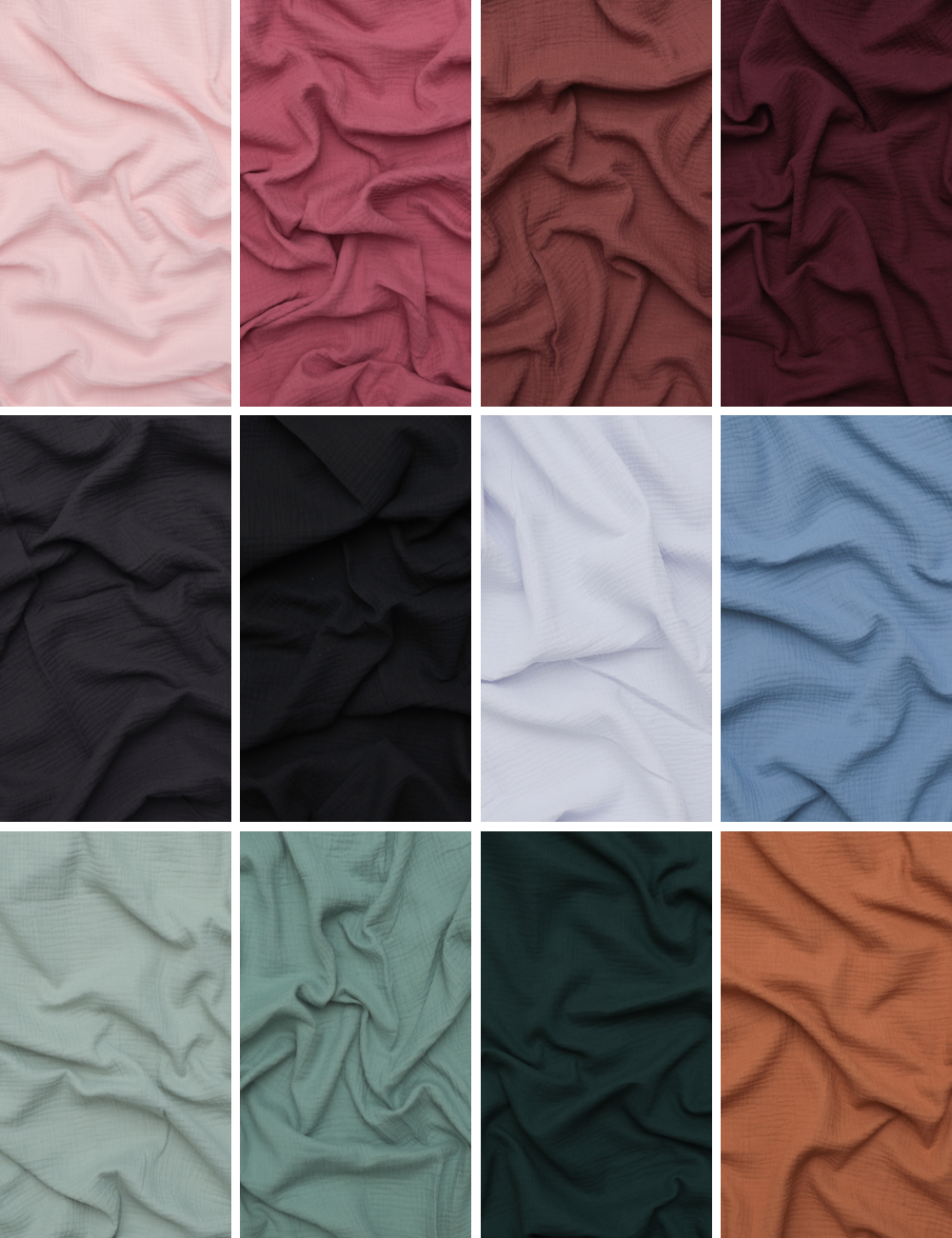 Experience the lightweight and luxurious texture of our Cotton Double Gauze in a variety of beautiful colours. Perfect for creating a range of stylish and comfortable pieces, it's great for baby clothes, swaddle blankets, and lightweight clothing for the whole family! Enjoy the soft touch and versatility of this fabric for your next project.