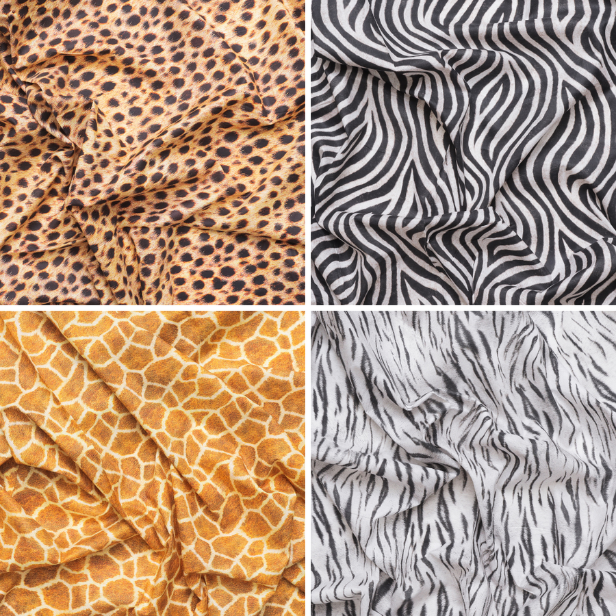 Add a touch of whimsy to your next project with our lightweight Cotton Lawn fabric featuring playful animal prints - zebra, cheetah, tiger, and giraffe. Perfect for any project that needs a bit of wild inspiration.