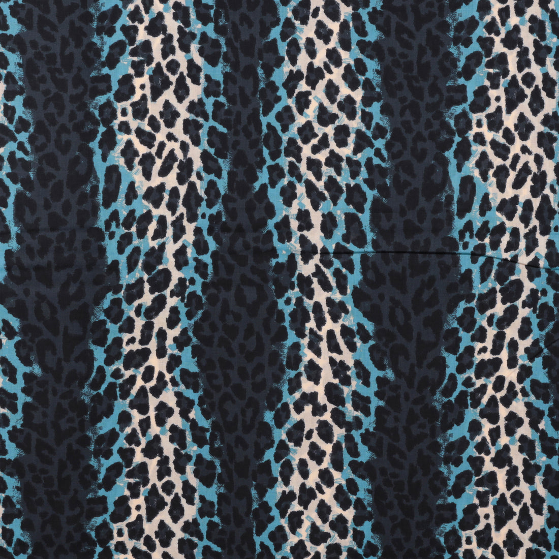 Spots and stripes oh my! This classic animal print cotton lawn features a fun twist, combining both spots and stripes with a pops of turquoise, navy and white. Don't be the odd one out, be purr-fectly fashionable! This fabric is sure to keep you looking your best - all the while making a statement.