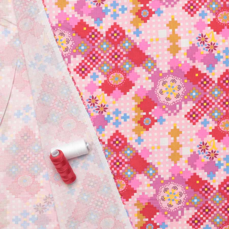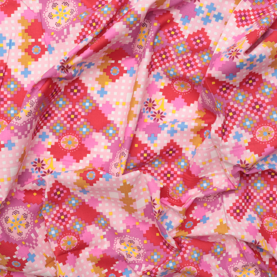 Experience the beauty of a kaleidoscope in this vibrant cotton fabric. The abstract design of pixelated cubes in pink, yellow, red, and blue will inspire your creativity for any quilting cotton project. Add a touch of color and playfulness to your next creation with this eye-catching fabric.