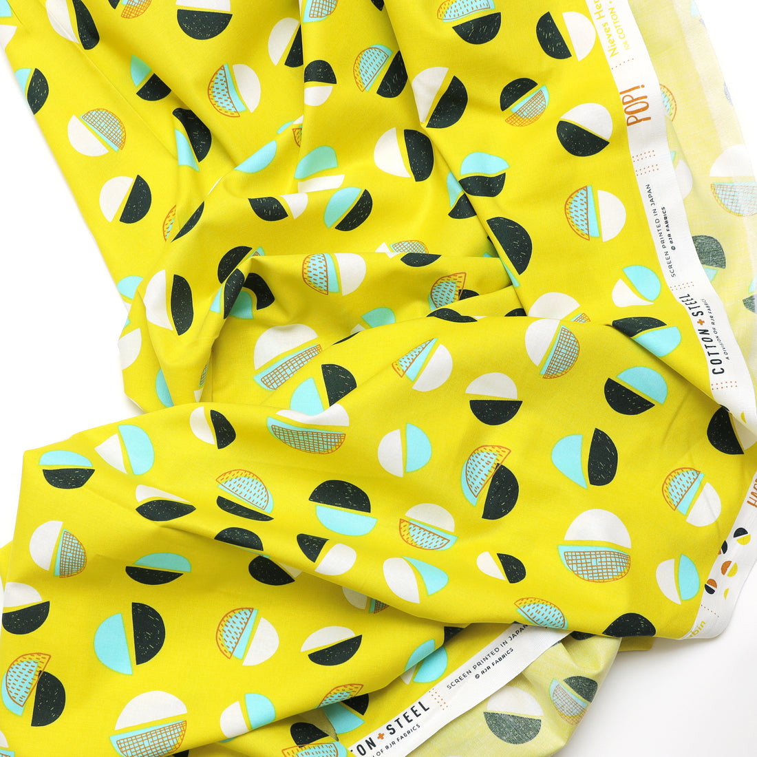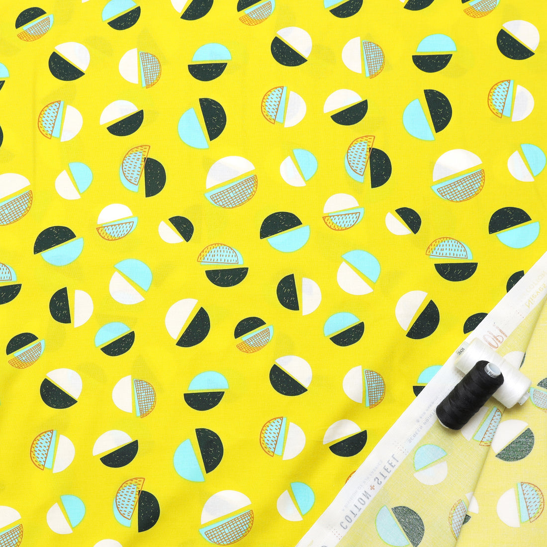 Get ready to add some quirky fun to your sewing projects with this Cotton + Steel Lime Time fabric! This playful pattern features pop art semi-circles in navy, white, and teal on a bright neon lime green background. Perfect for making a bold statement in your designs.