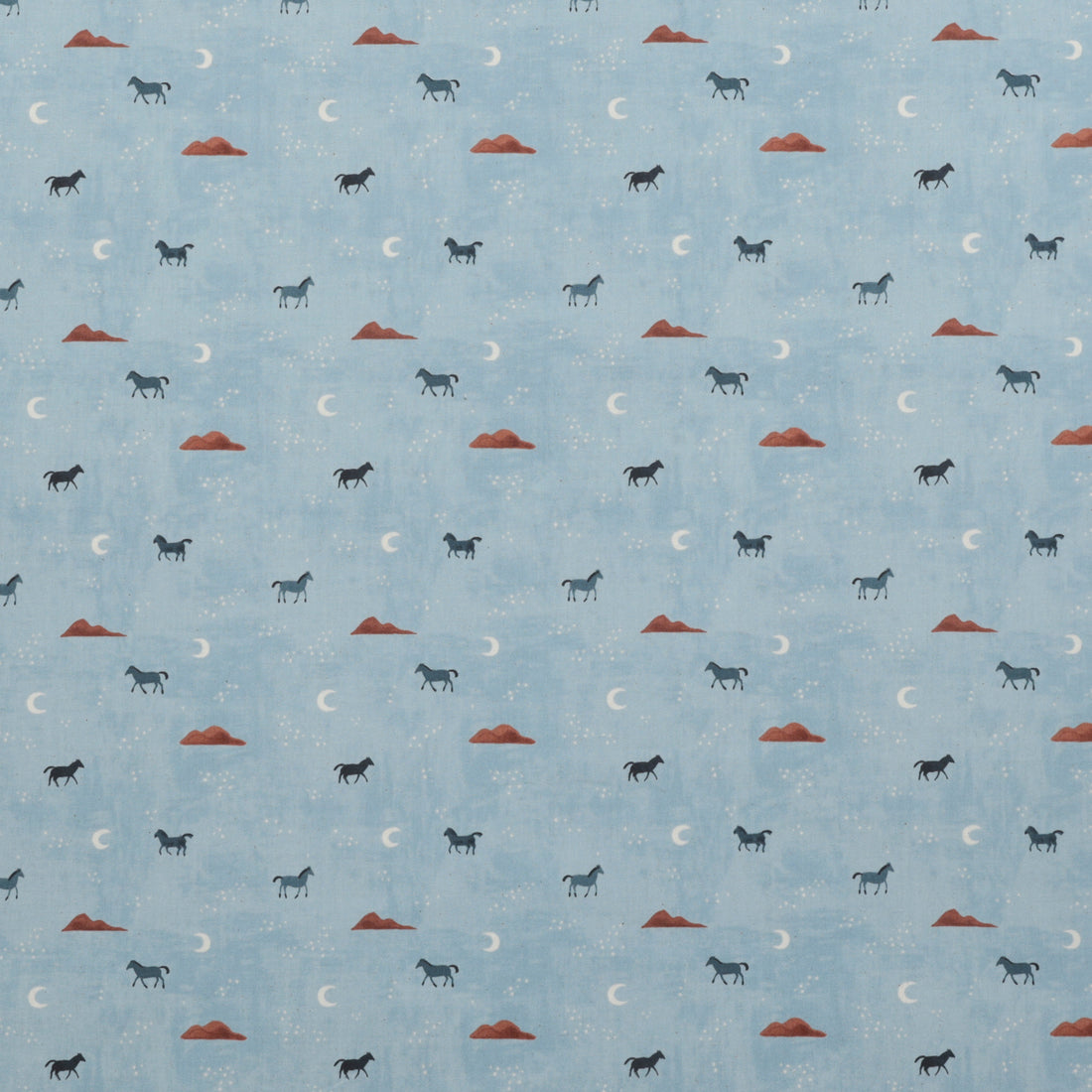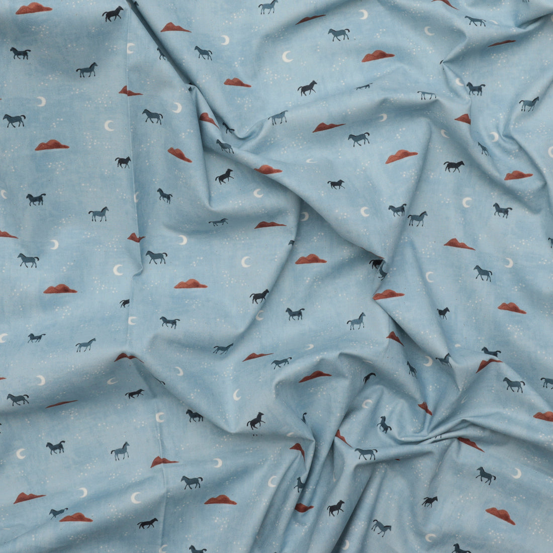 Cotton + Steel's Salt River quilting cotton features unique western imagery including horses, moons, and mountains, all set against a light blue background. The premium-quality cotton fabric is perfect for quilting projects and will last, allowing you to enjoy it till twilight and beyond.