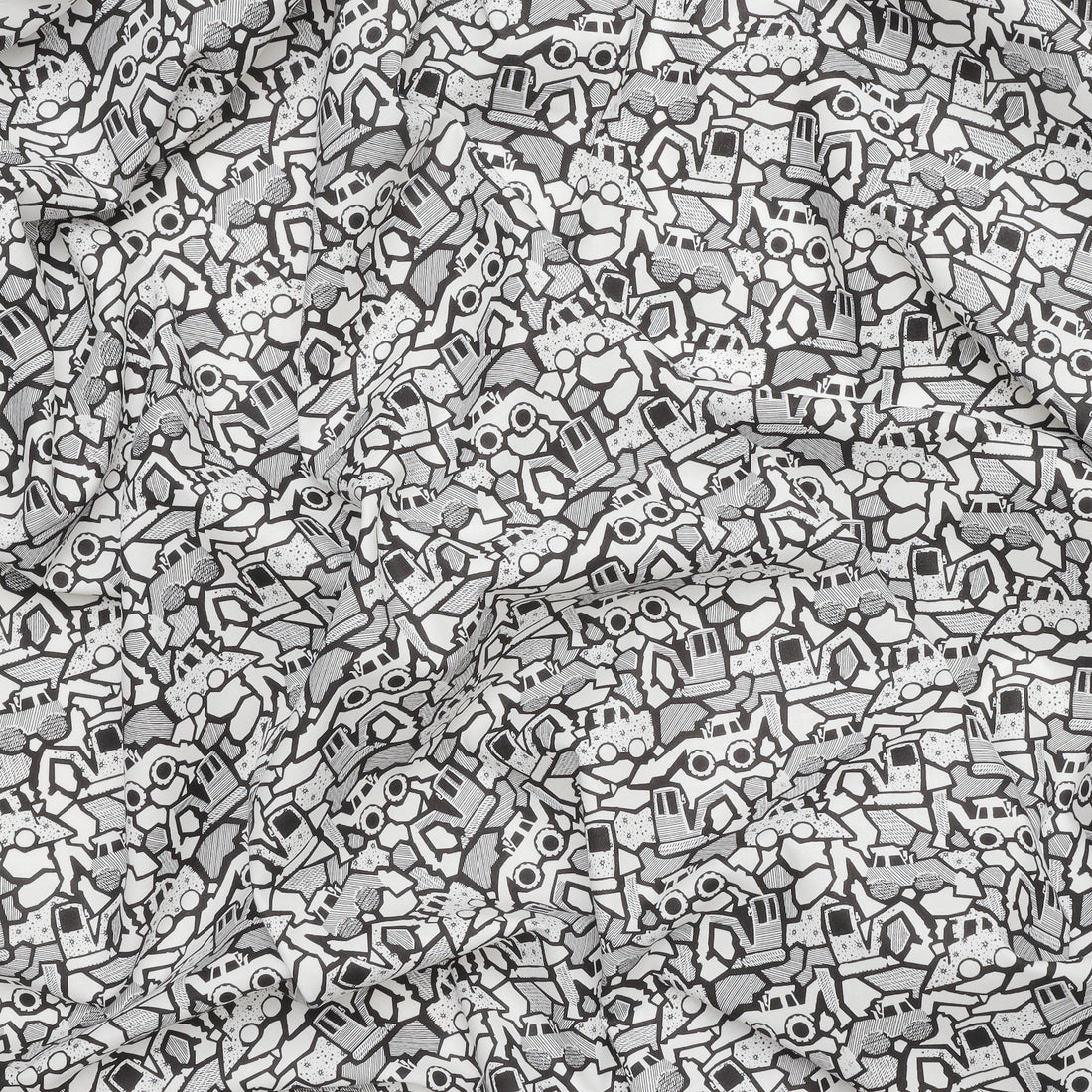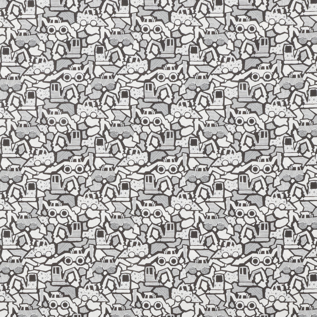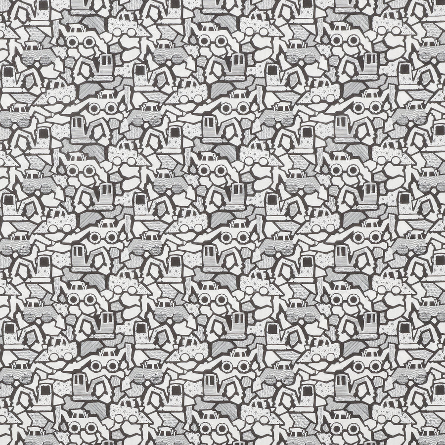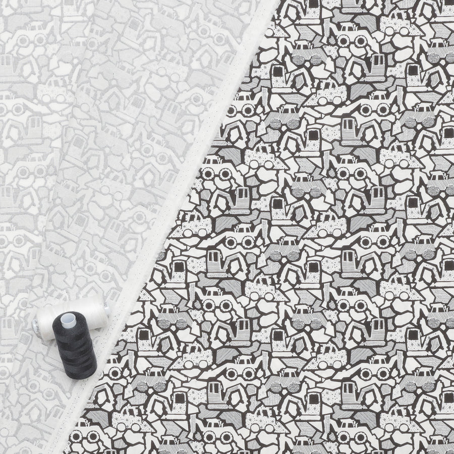 Stylized white, grey, and black diggers interlock in an abstract pattern on this fun quilting cotton.
