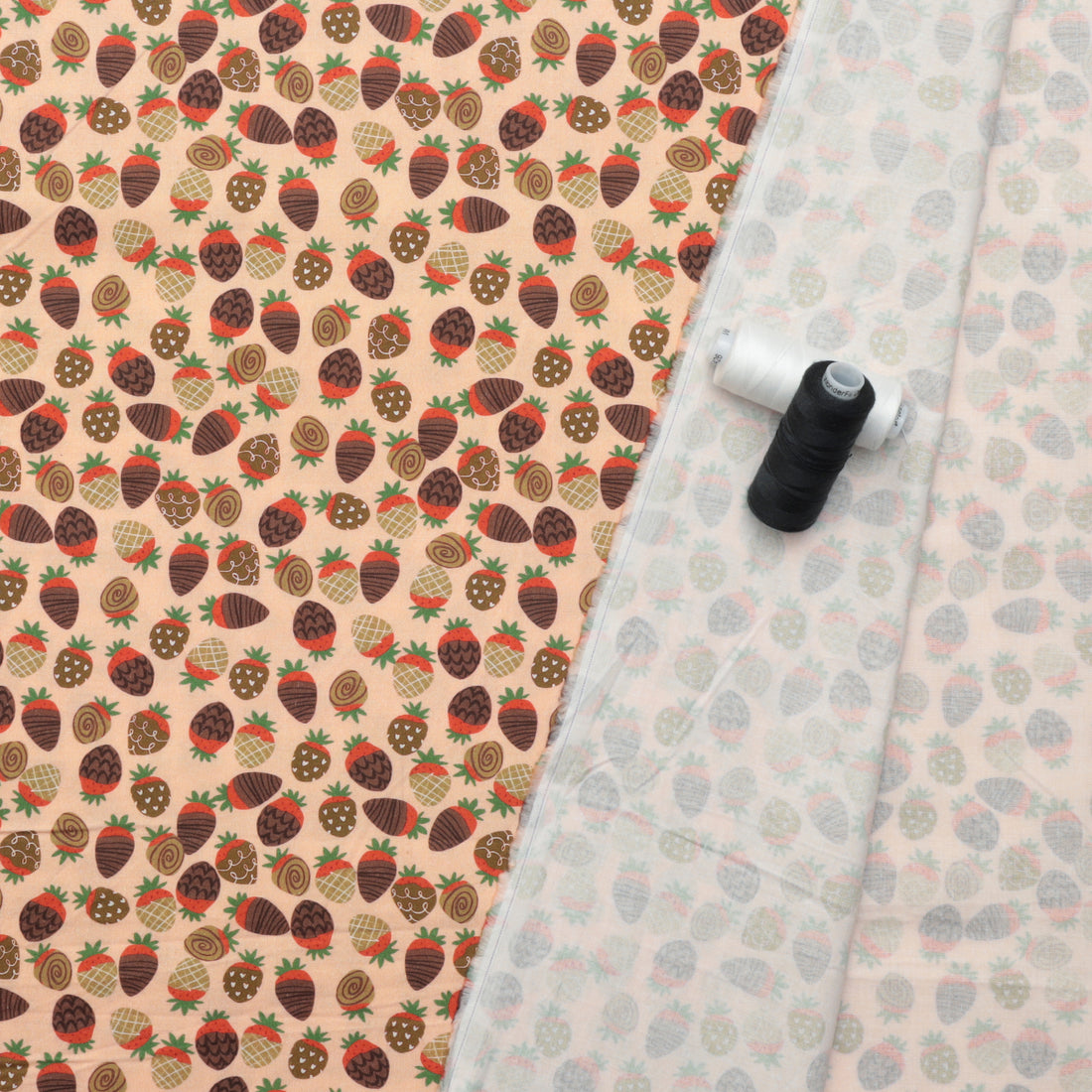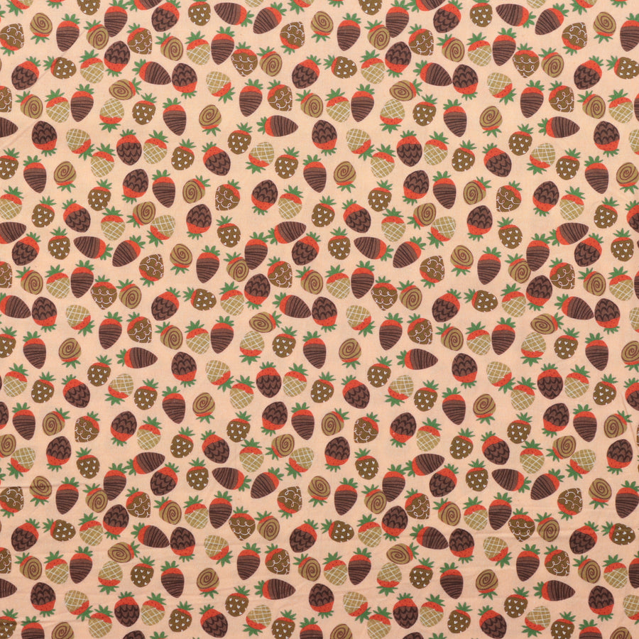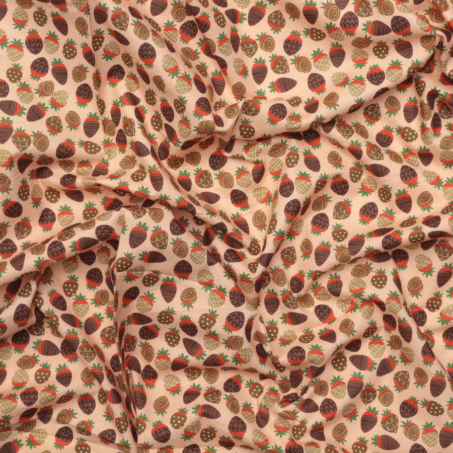 Chocolate-covered strawberries, so delicious-looking you'll want to take a bite, adorn this festive fruit cotton set against a soft pink background.