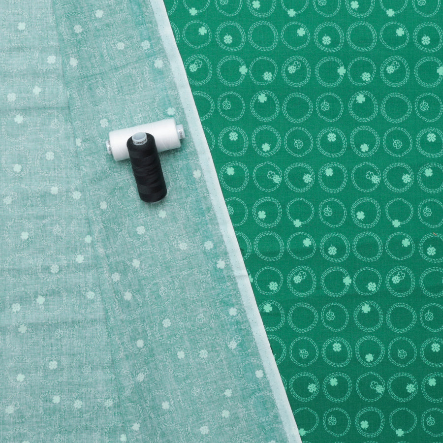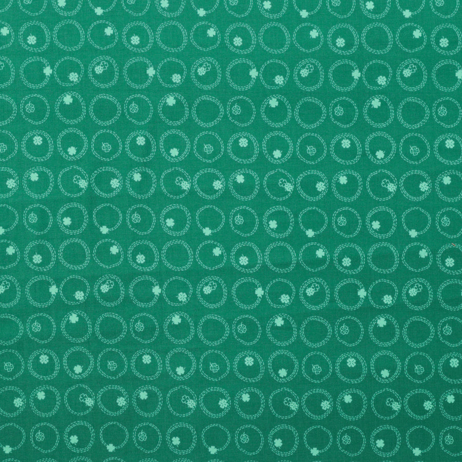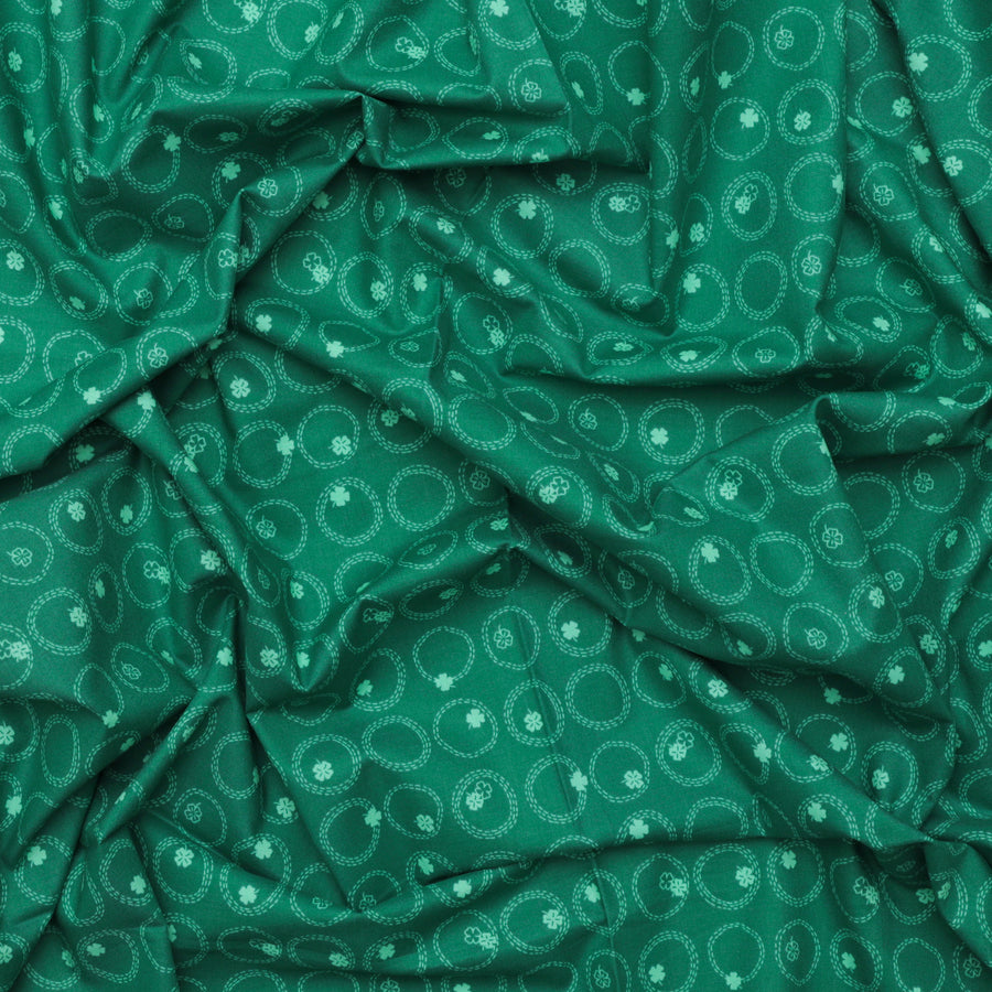 Small four-leaf clovers inside of dashed circles on a green background. Shamrock this amazing cotton!