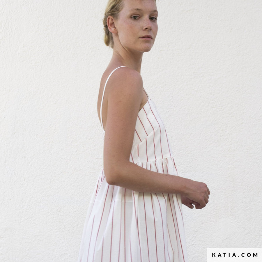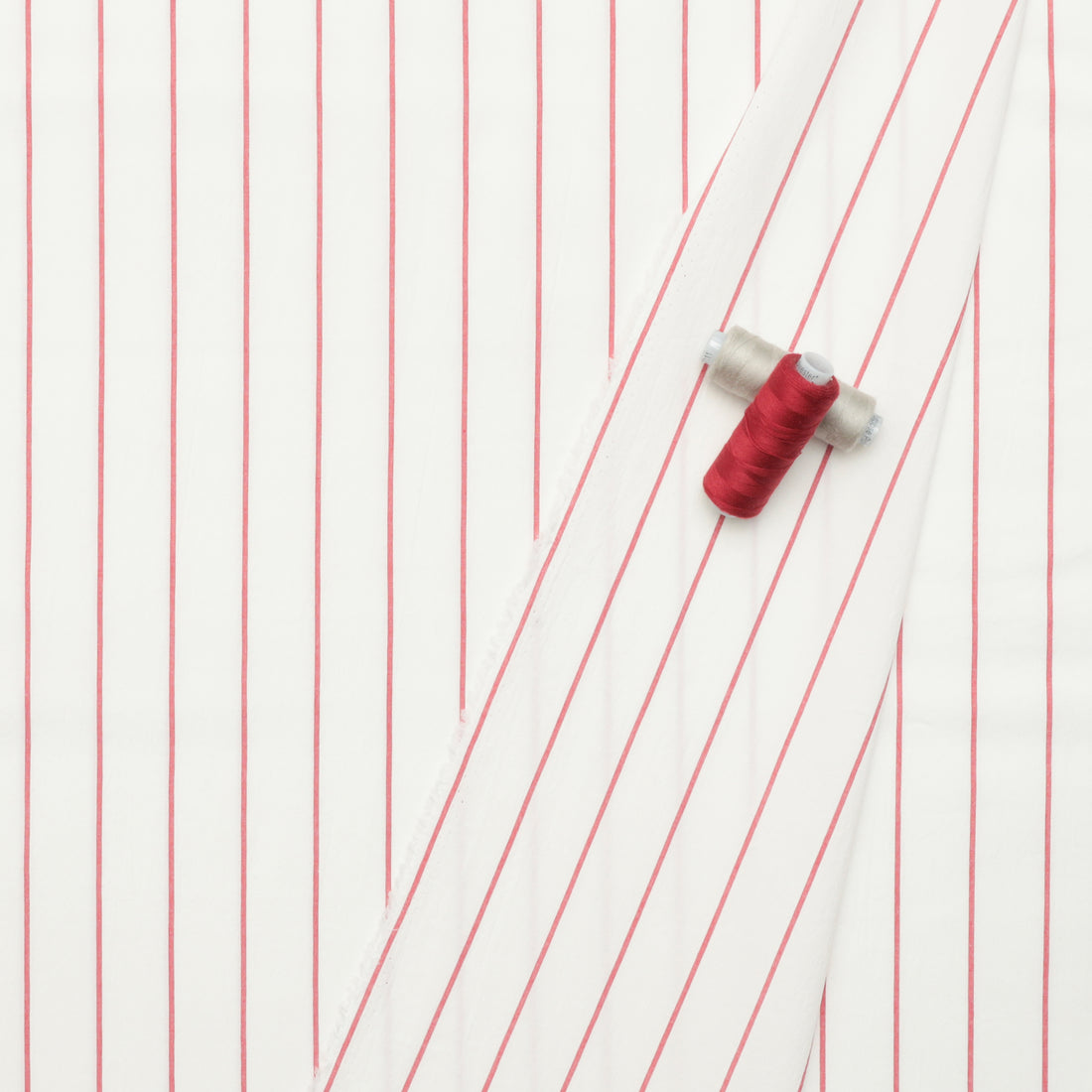 Slightly stretchy, woven cotton-based fabric with a soft wrinkled effect. Nautical-inspired vertical red stripe. Make all kinds of summer garments with this fabric, from dresses to shorts and button up shirts.