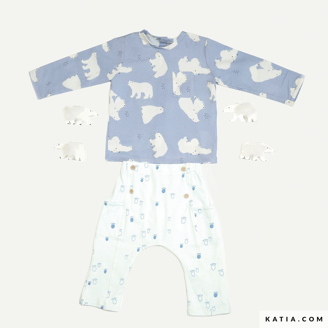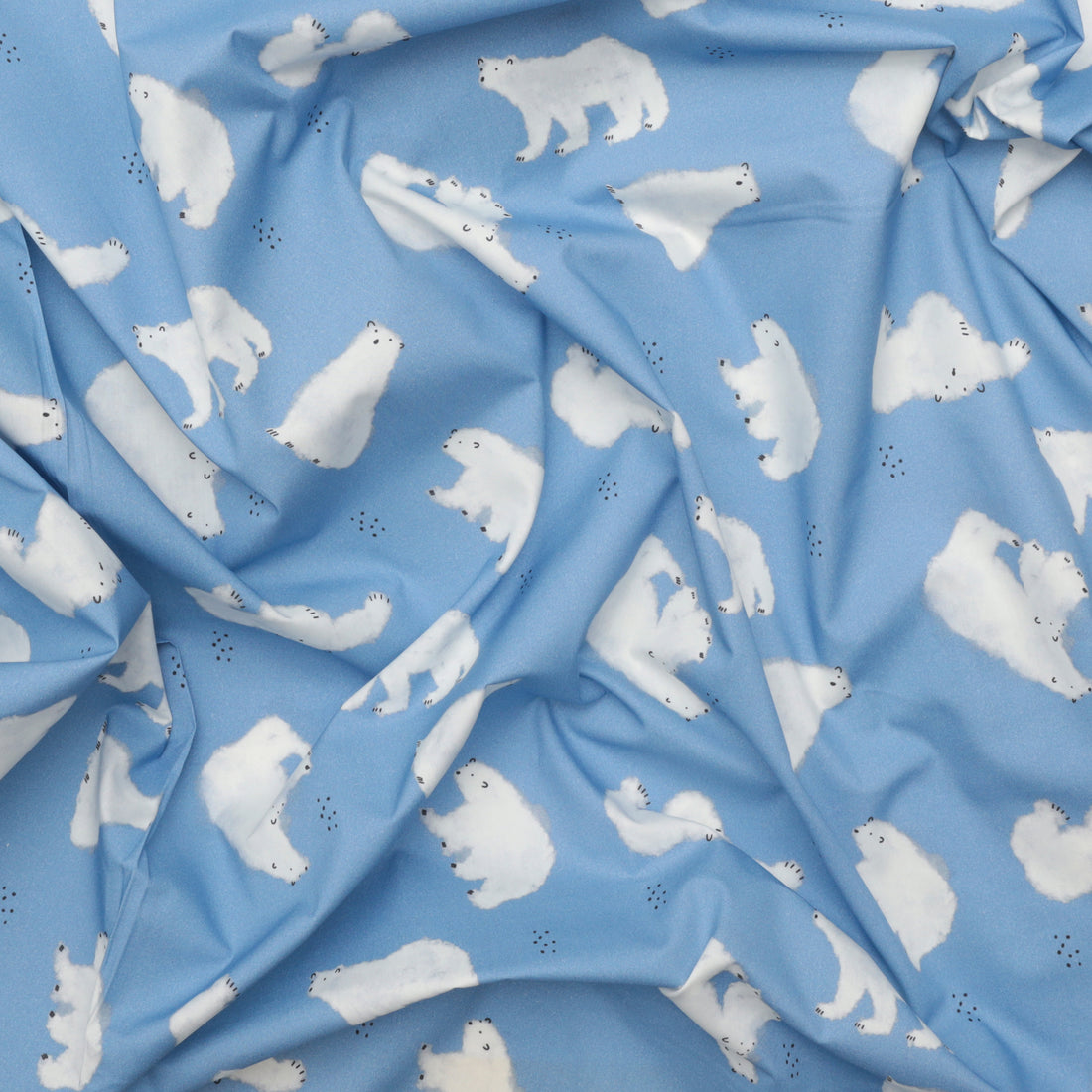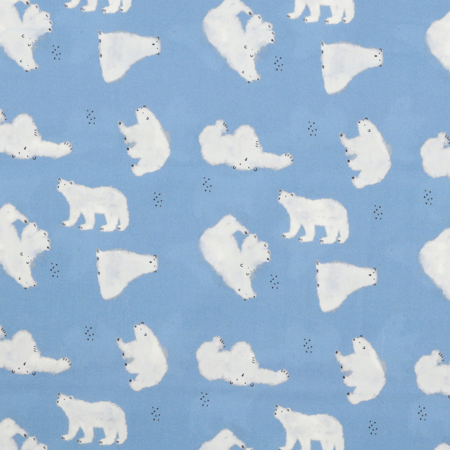 Katia's cotton poplin offers a wintry wonder of polar bears and cubs cavorting on a sea-blue backdrop! You'll have a blast basking in the quirky character of these snow-capped pals!
