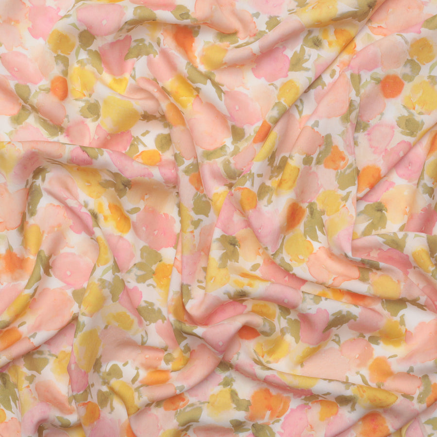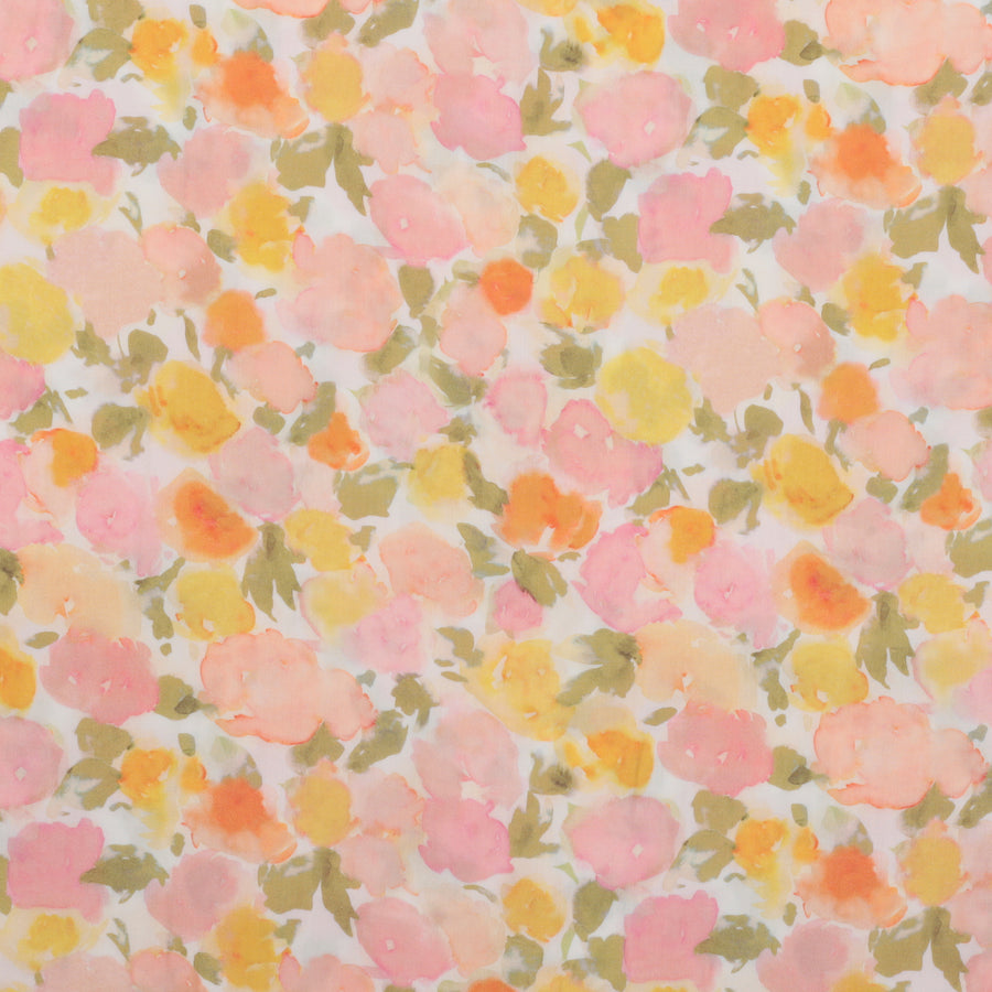 Make your wardrobe blossom in this sweet Sadie Lyocell Fabric. Featuring an eye-catching digital print of soft pinks, yellows, and oranges with pops of green on a crisp white background, you'll be sure to turn heads. Show off your style with ease and make any day a good one!