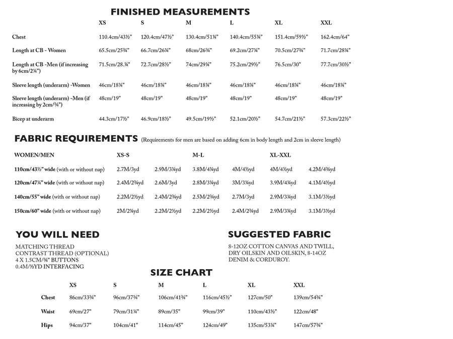 This pattern is designed for mid weight utility fabrics like denim and canvas, the heavier the fabric the more structured your silhouette will be. Lighter weight fabrics will result in a more relaxed, softer silhouette.