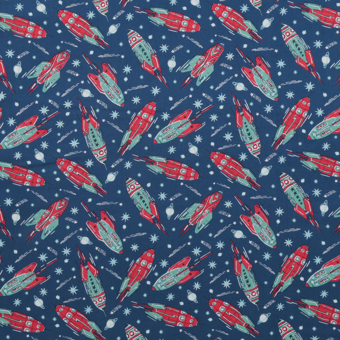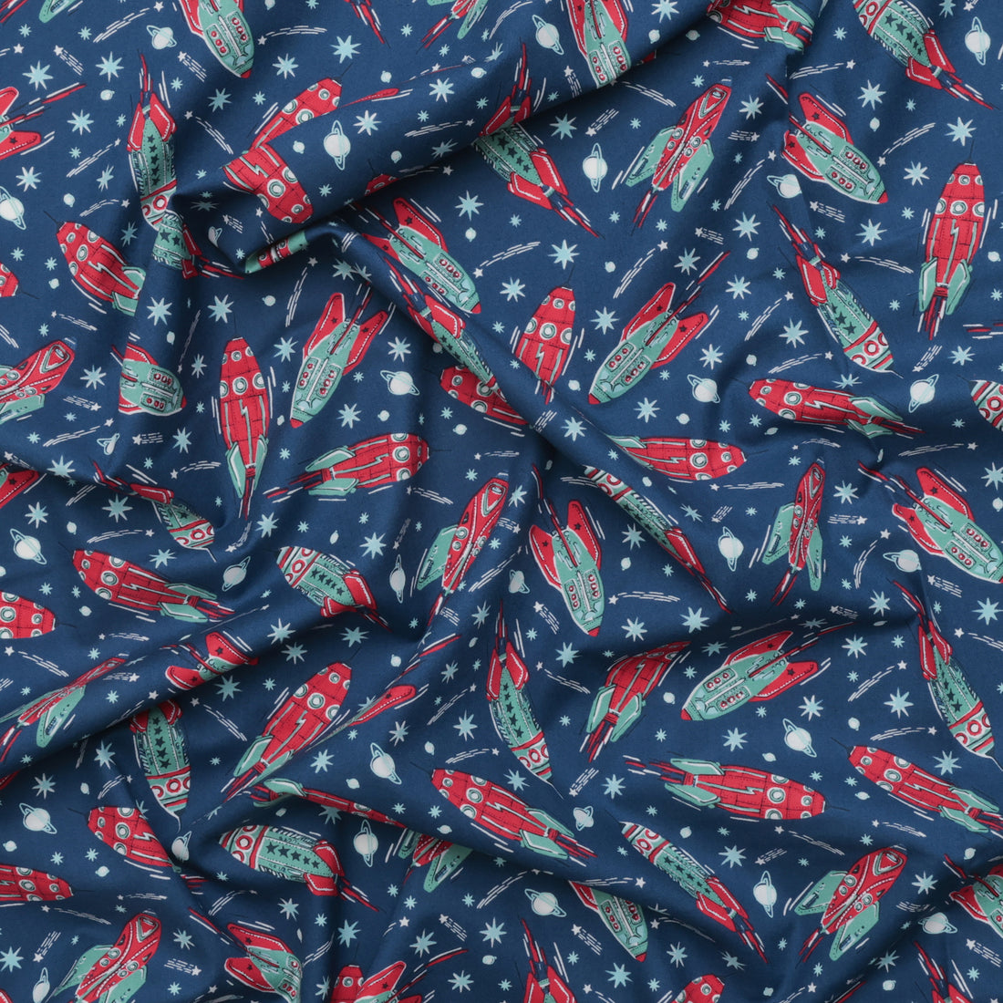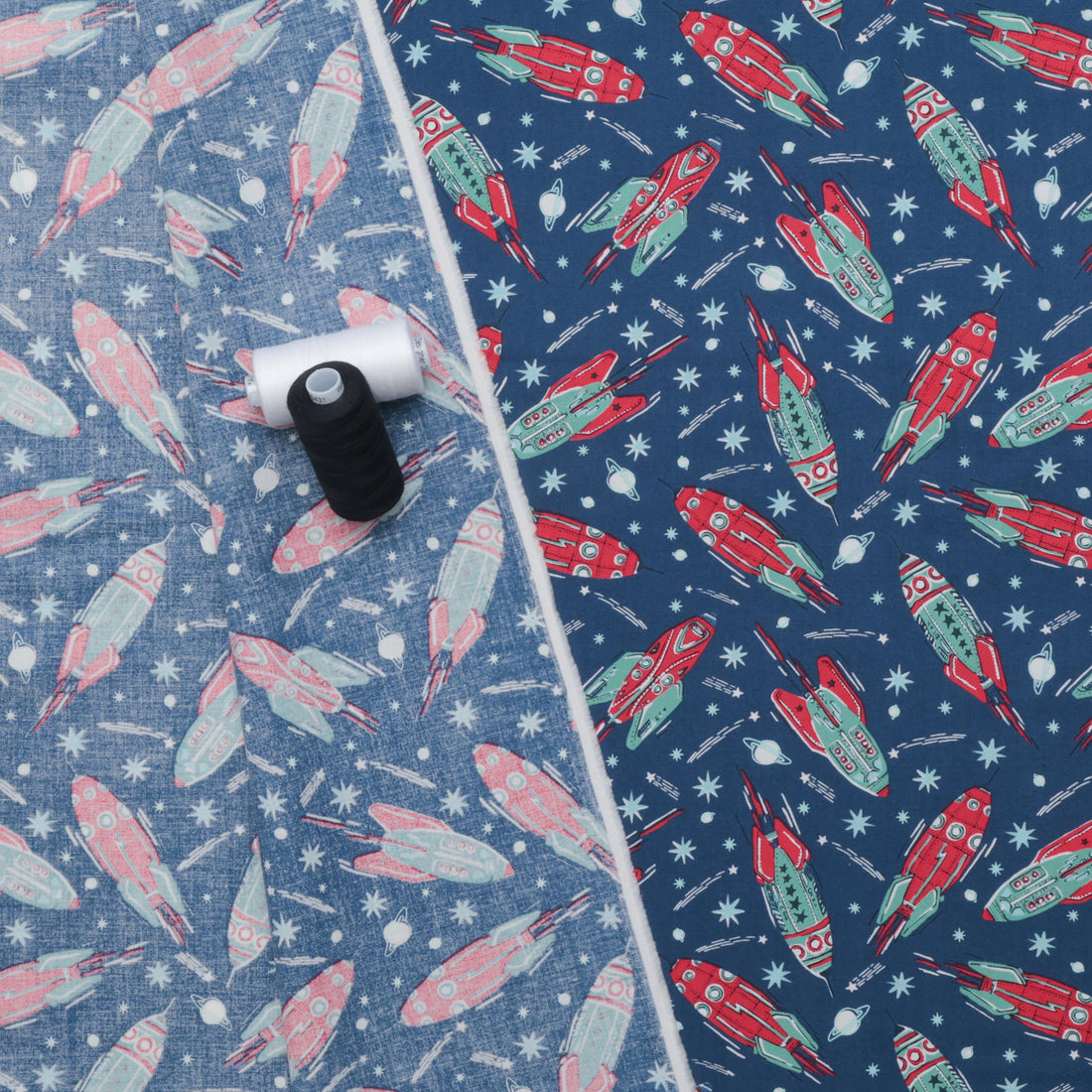 3, 2, 1 Blast off is a celebration of space exploration with a vintage twist. With its retro color palette and imagery, this collection is sure to transport you back in time when space exploration was just beginning. Hand-drawn vintage rockets and robots adorn the prints, perfect for making small projects like pillows and totes, or a whole quilt.