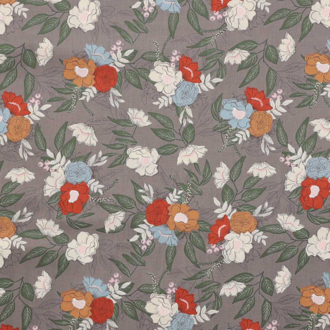 Take a leisurely 'stroll' with Moda's Slow Stroll Bouquet Walnut cotton fabric. This playful botanical print features charming groups of blue, red, white, and brown flowers on a stylish grey background. Embrace the subtle beauty and whimsical vibes of this fabric in your next project!