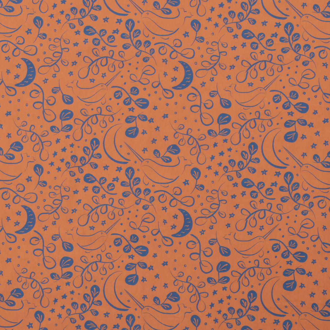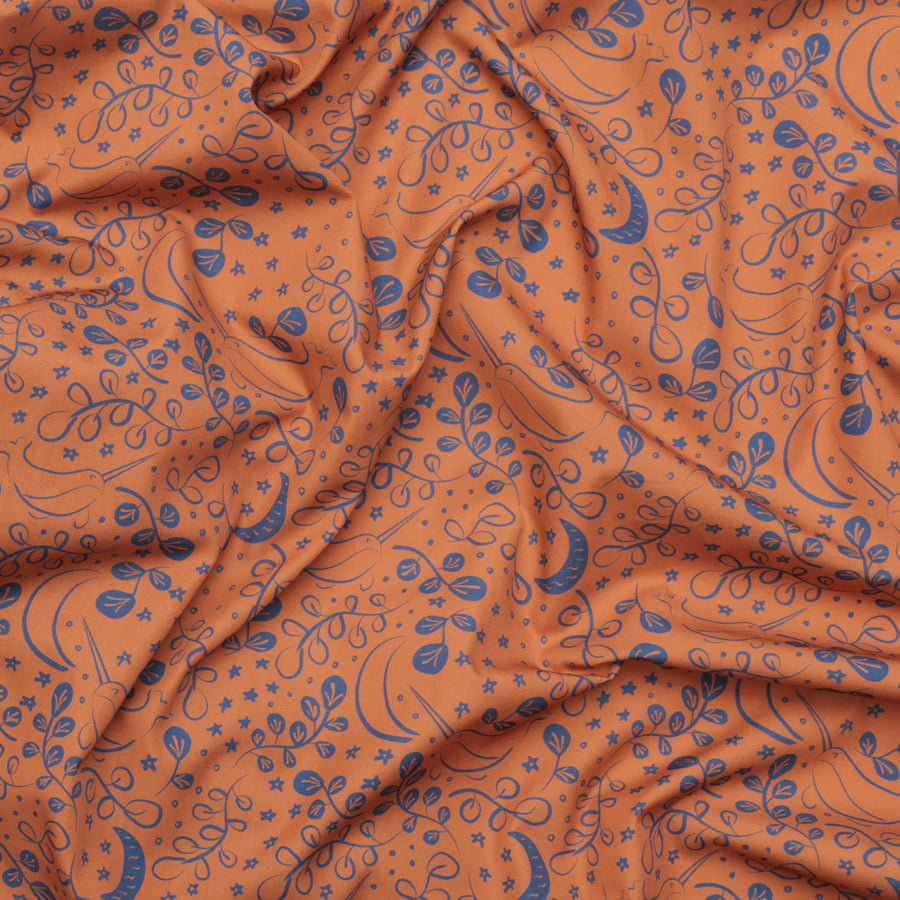 This large, bold design on 100% Organic Cotton Poplin is a light weight fabric with a beautiful hand feel. Featuring dancing blue narwhales, moons, and stars against a golden background. Where just like these mystical creatures, true connection can feel like magic for the soul.