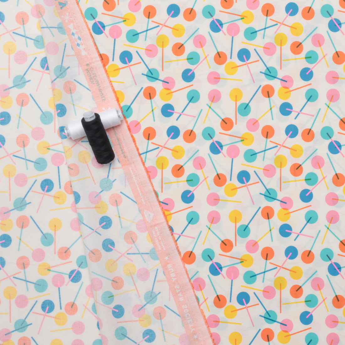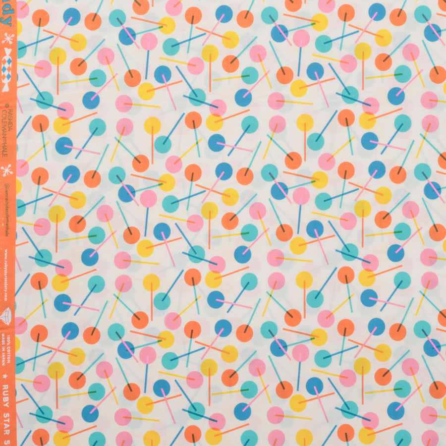 Indulge in the sweetness of the Ruby Star quilting cotton, featuring a multicolored display of lollipops on a cream background. Bring a touch of childhood nostalgia and sweeten up your sewing projects with this fun and playful fabric. (Sugar rush not included!)
