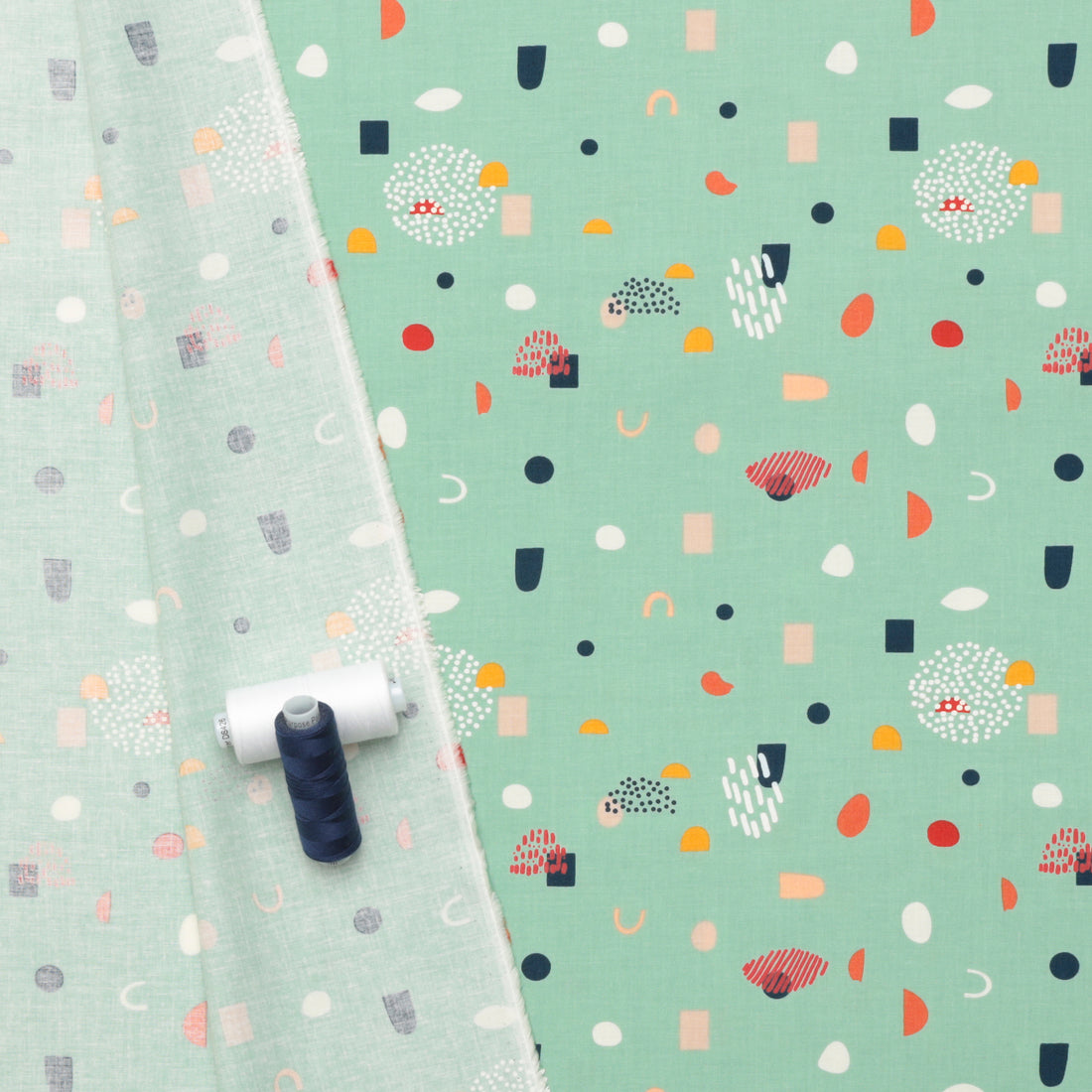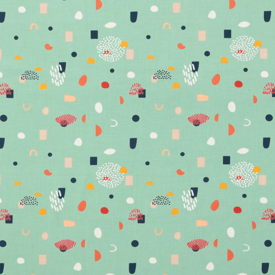 Introducing Ruby Star - Cotton - Frisky - Catch Me - Chill! Add a touch of color and playfulness to your sewing projects with tiny abstract shapes in yellow, blue, orange, pink and white. This teal green quilting cotton will surely catch your eye and inspire your creativity.