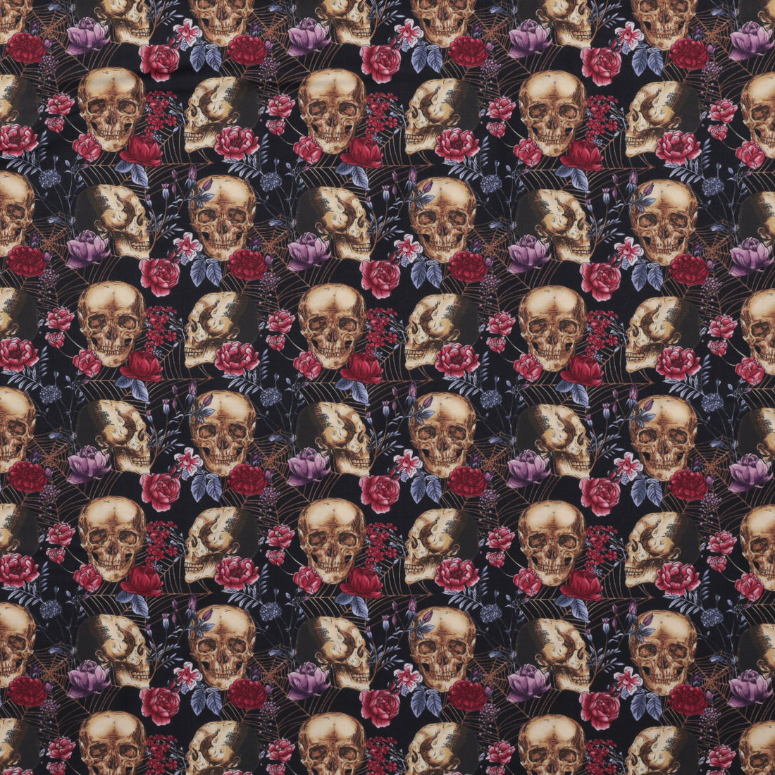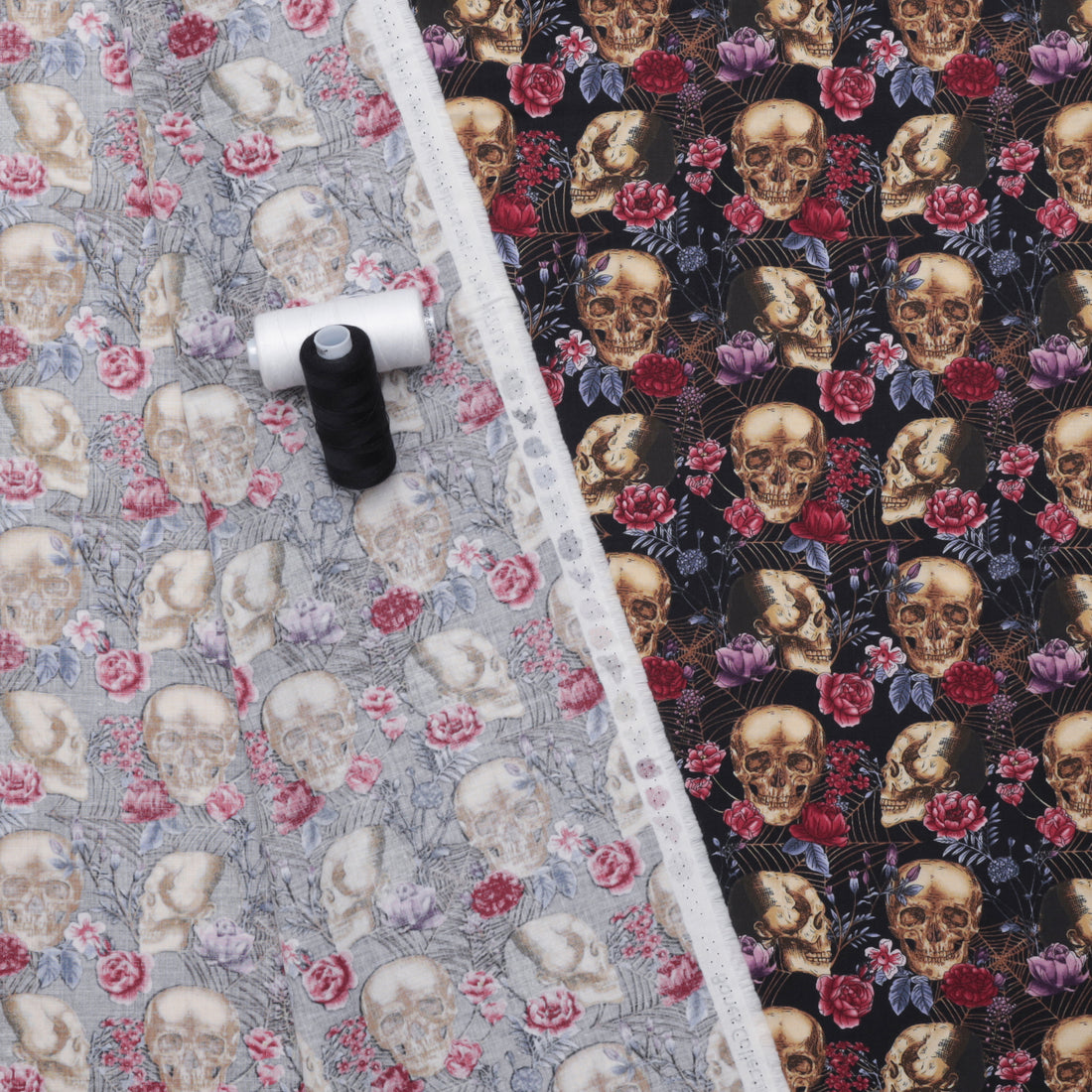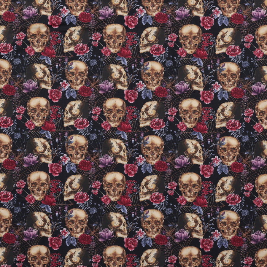 Featuring an edgy gothic print of skulls against a black background, enveloped by cobwebs and delicate pink and purple flowers. Embrace the spooky spirit of Halloween!